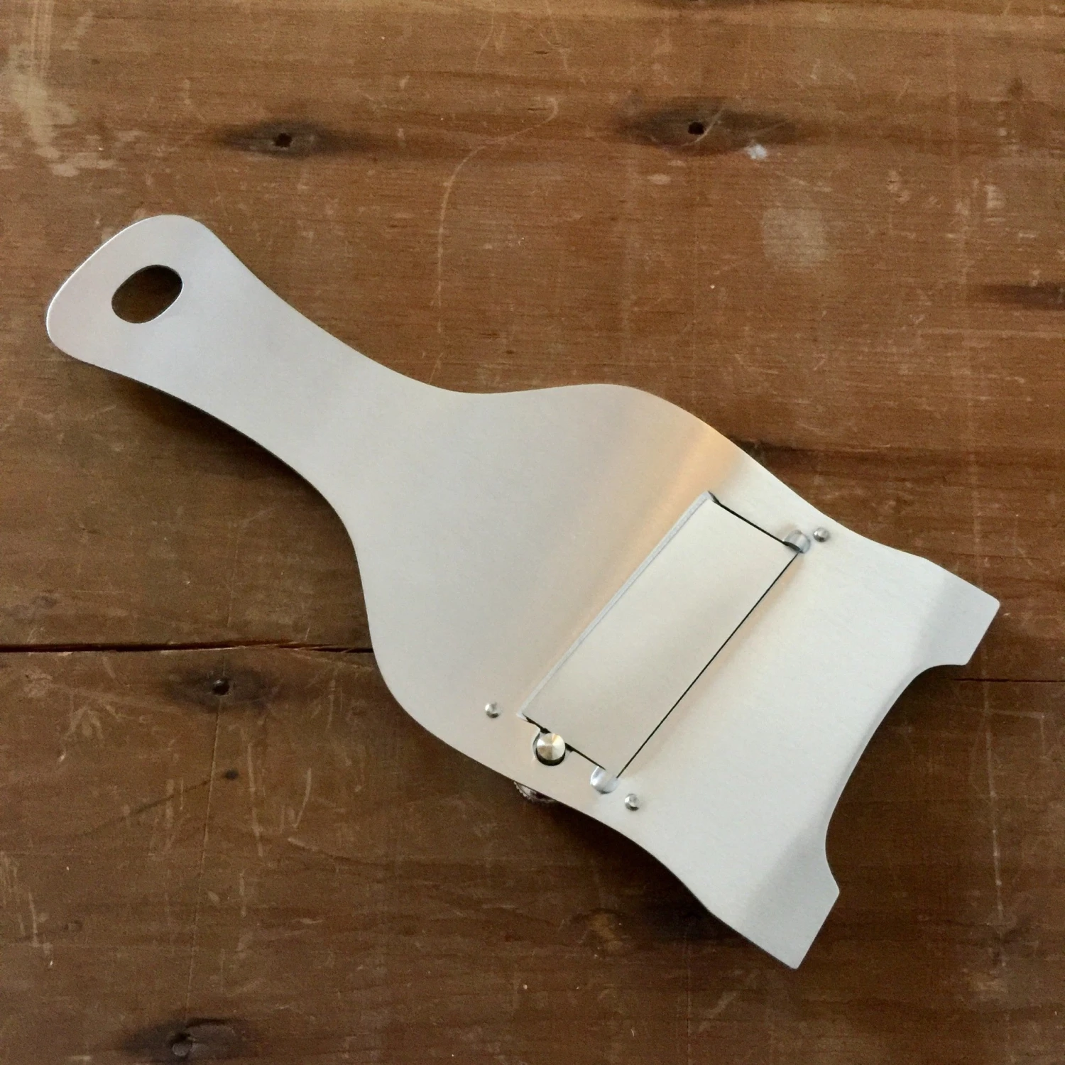 Stainless steel frame with a straight blade. The adjustable blade allows for controlled shaving of truffles at different thicknesses.