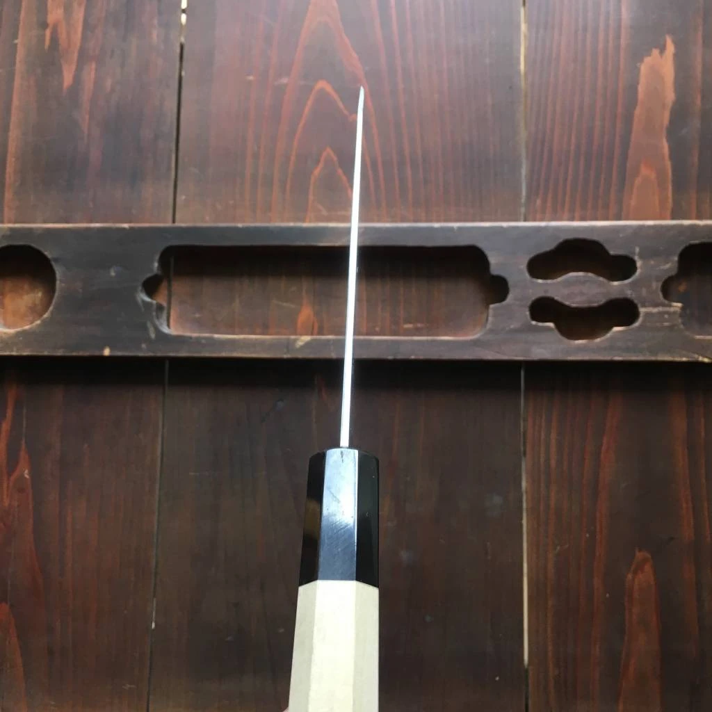Ashi Hamono was established in 1948 in Sakai City Japan; a major center of traditional knife making. Ashi makes knives utilizing a one piece of steel (rather than forge laminated 2/3 layer blade), called zenkou construction. Ashi’s Ginga line is famous for it’s thinness and precision, utilizing top quality carbon and stainless steels. These knives have an excellent fit and finish, from their grinding to heat treatment and hafting.