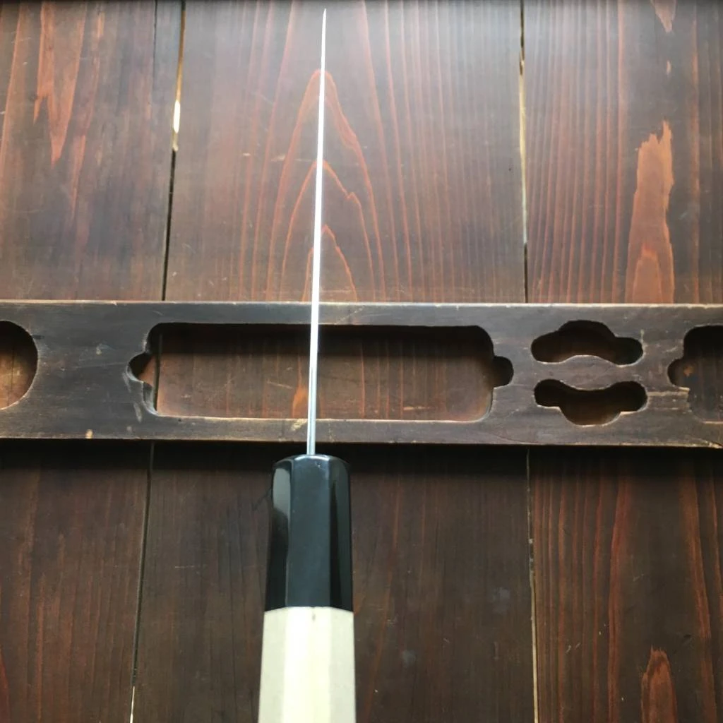 Ashi Hamono was established in 1948 in Sakai City Japan; a major center of traditional knife making. Ashi makes knives utilizing a one piece of steel (rather than forge laminated 2/3 layer blade), called zenkou construction. Ashi’s Ginga line is famous for it’s thinness and precision, utilizing top quality carbon and stainless steels. These knives have an excellent fit and finish, from their grinding to heat treatment and hafting.