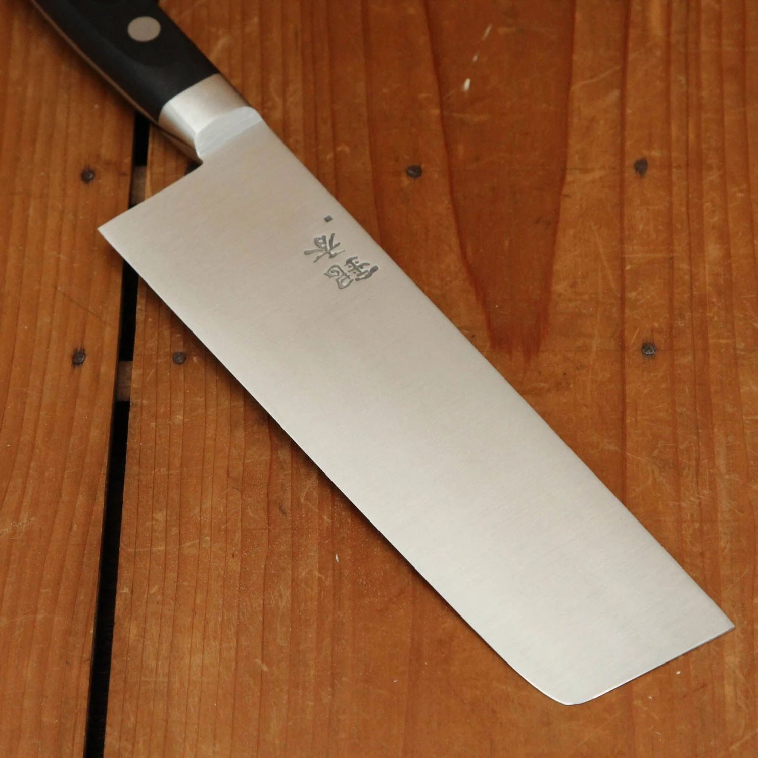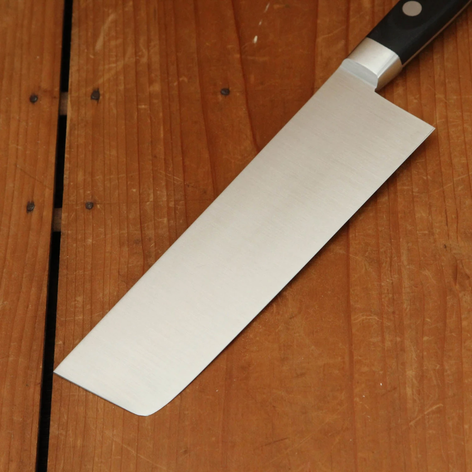 Ashi Hamono 180mm nakiri knife with Swedish stainless steel blade and western style riveted pakka wood handle. Saya cover is included.