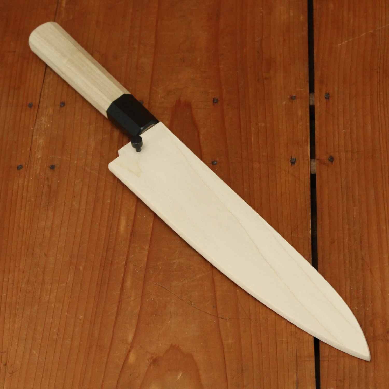 Ashi Hamono 210mm gyuto chef knife with Swedish stainless steel blade. Octagon magnolia wood handle and water buffalo horn ferrule. Saya cover is included.