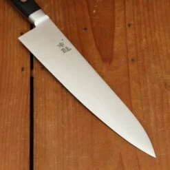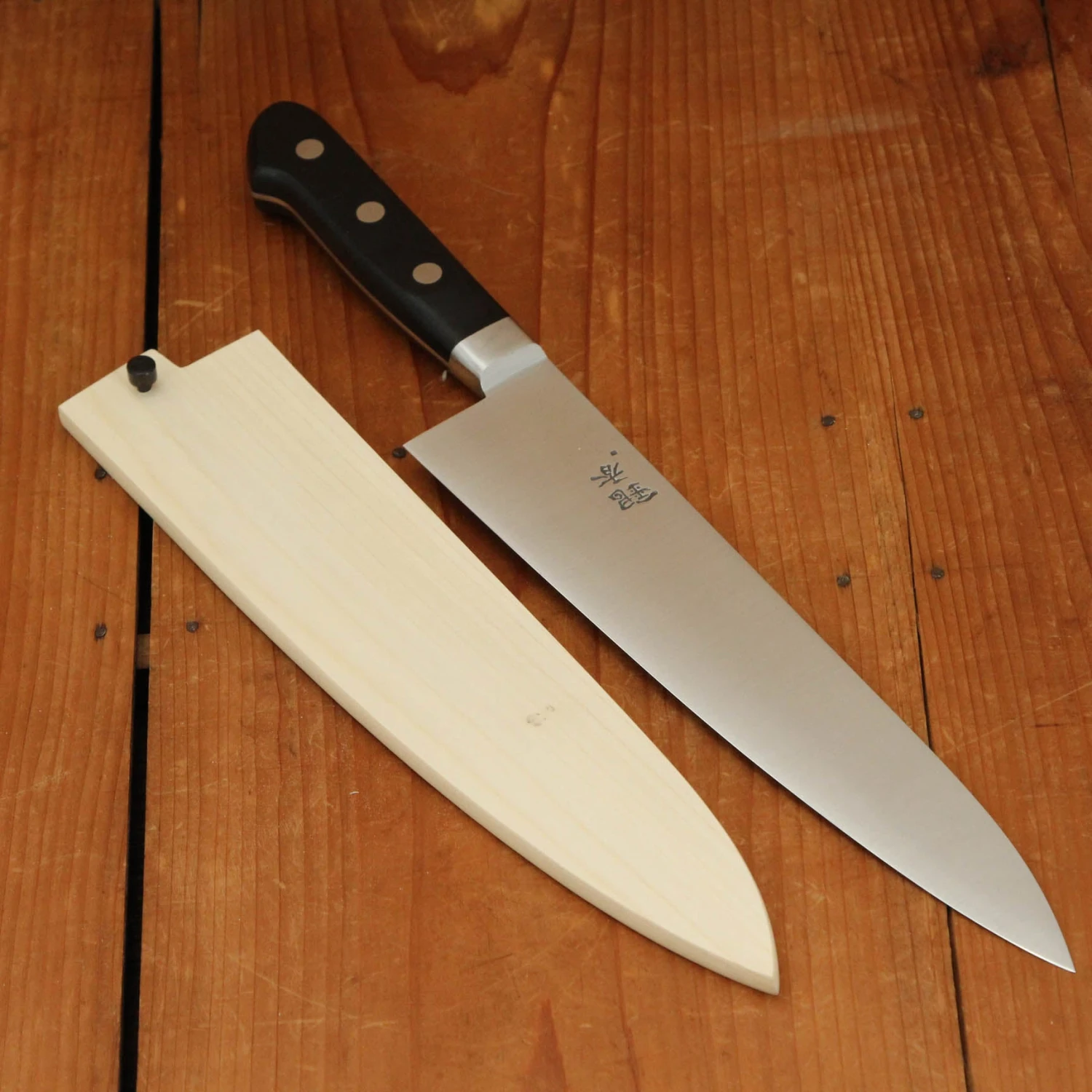 Ashi Hamono 240mm gyuto chef knife with Swedish stainless steel blade and western style riveted pakka wood handle. Saya cover is included. HRC 59.