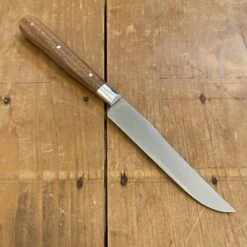 Au Sabot 4″ paring knife made in old French design with hand ground yatagan shaped carbon steel blade stainless steel bolster and bubinga handles.