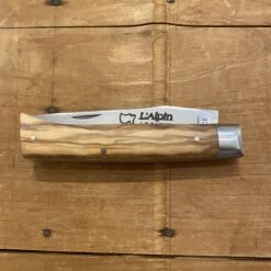 10cm Alpin pattern knife from French Alpine region, made in Thiers France for Au Sabot with stainless steel blade and bolsters with olive handle scales.