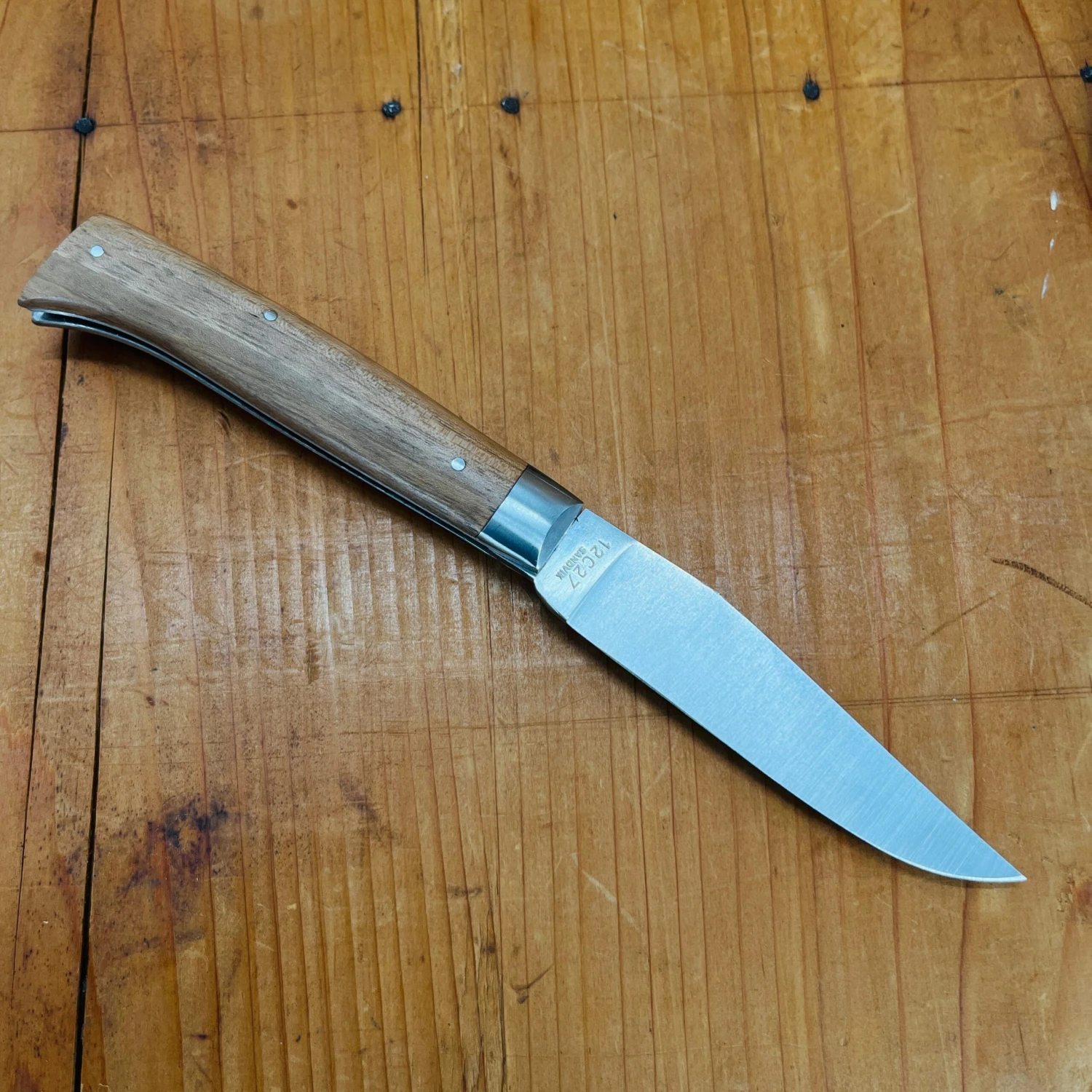 Alpin pattern knife from French Alpine region, made in Thiers France for Au Sabot with stainless steel blade and bolsters and walnut handle scales.