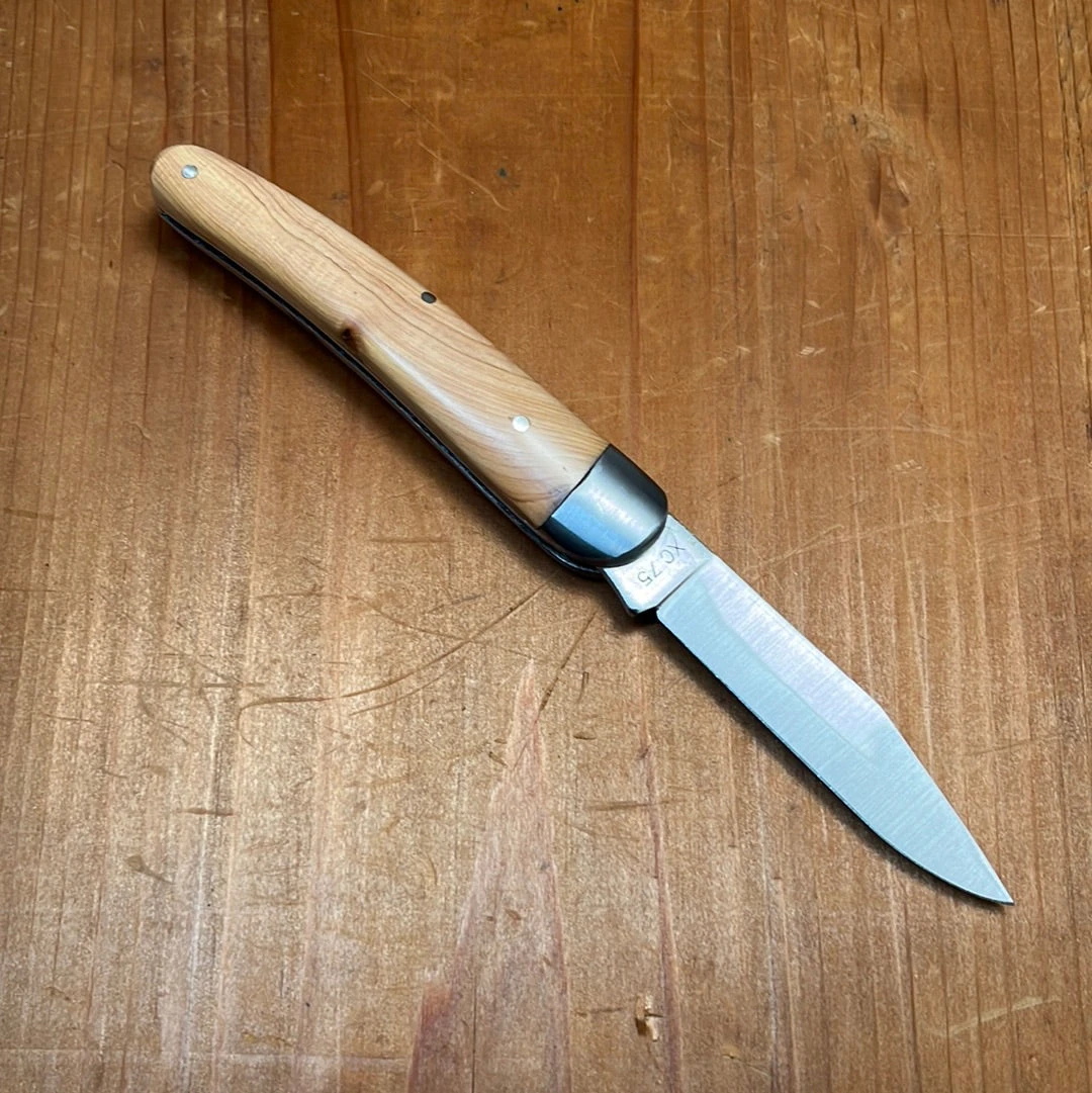 10cm Alsacien pattern knife from the Alsace region in north east France. Made in Thiers France for Au Sabot with carbon steel blade and bolster with juniper handle scales.