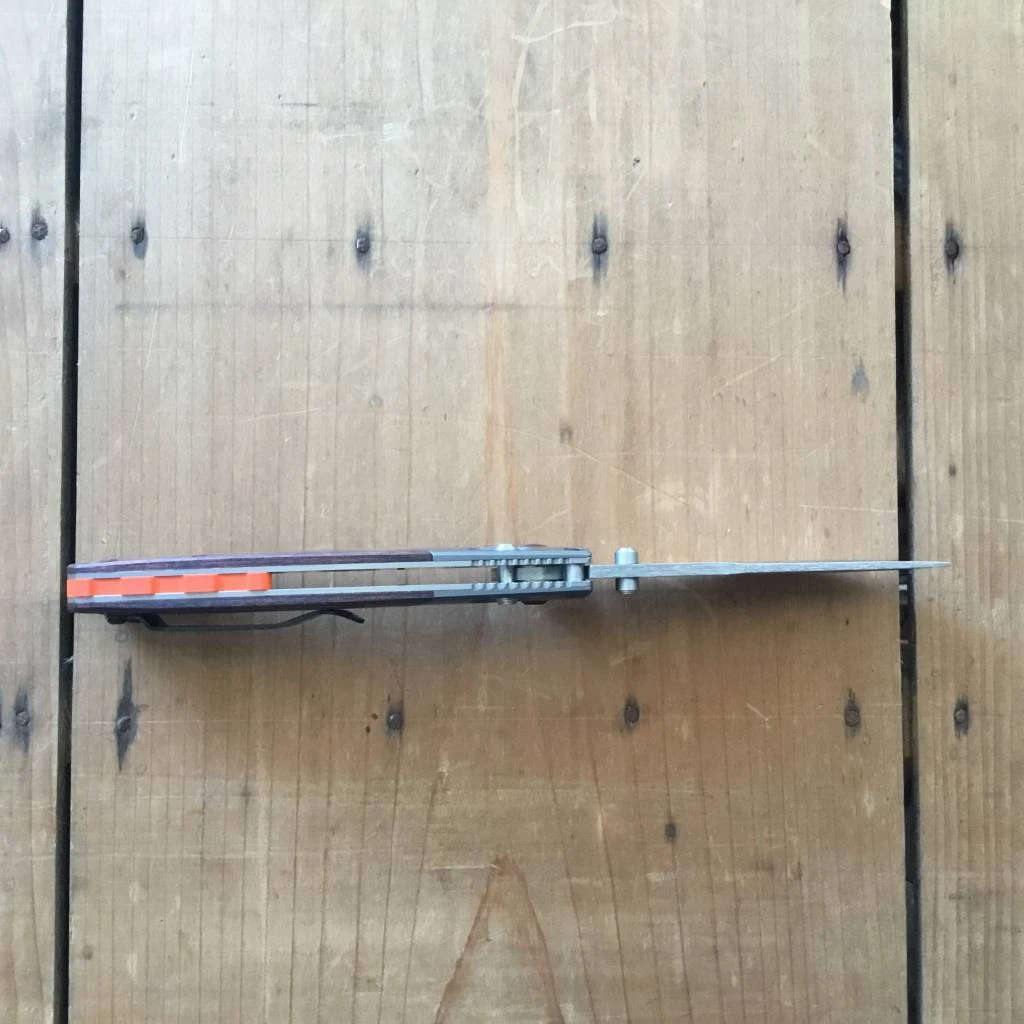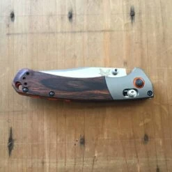 The Crooked River Mini folder has a 3.4″ clip-point blade made from CPM-S30V stainless steel. Handle is stabilized wood with anodized aluminum bolsters and stainless steel liners. AXIS lock mechanism.