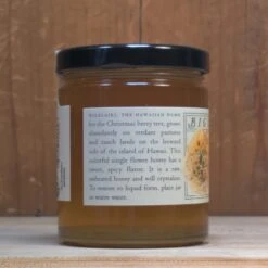 Also known as Hawaiian Christmas berry, this unique Hawaiian honey is ambrosial with a subtle spicy flavor, liquid texture and light amber color. Recognizable by its festive red berries, the Wilelaiki plant is beautifully illustrated on the label of this gourmet honey. Perfect for pairing with cheese, winter vegetables and adding to salad dressings.
