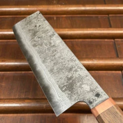 Blenheim Forge Classic Range 150mm Nakiri. Aogami Super carbon steel core with iron damascus acid etched cladding with kurouchi finish. Walnut & Copper octagon handle.