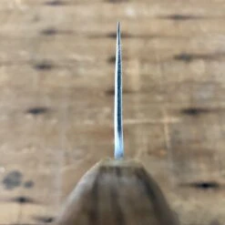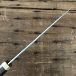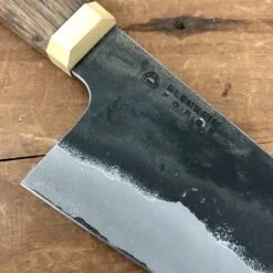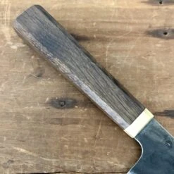 Blenheim Forge 170mm Funayuki / short chef knife, fumed oak and brass ferrule handle. Aogami Super carbon steel core with stainless steel cladding.