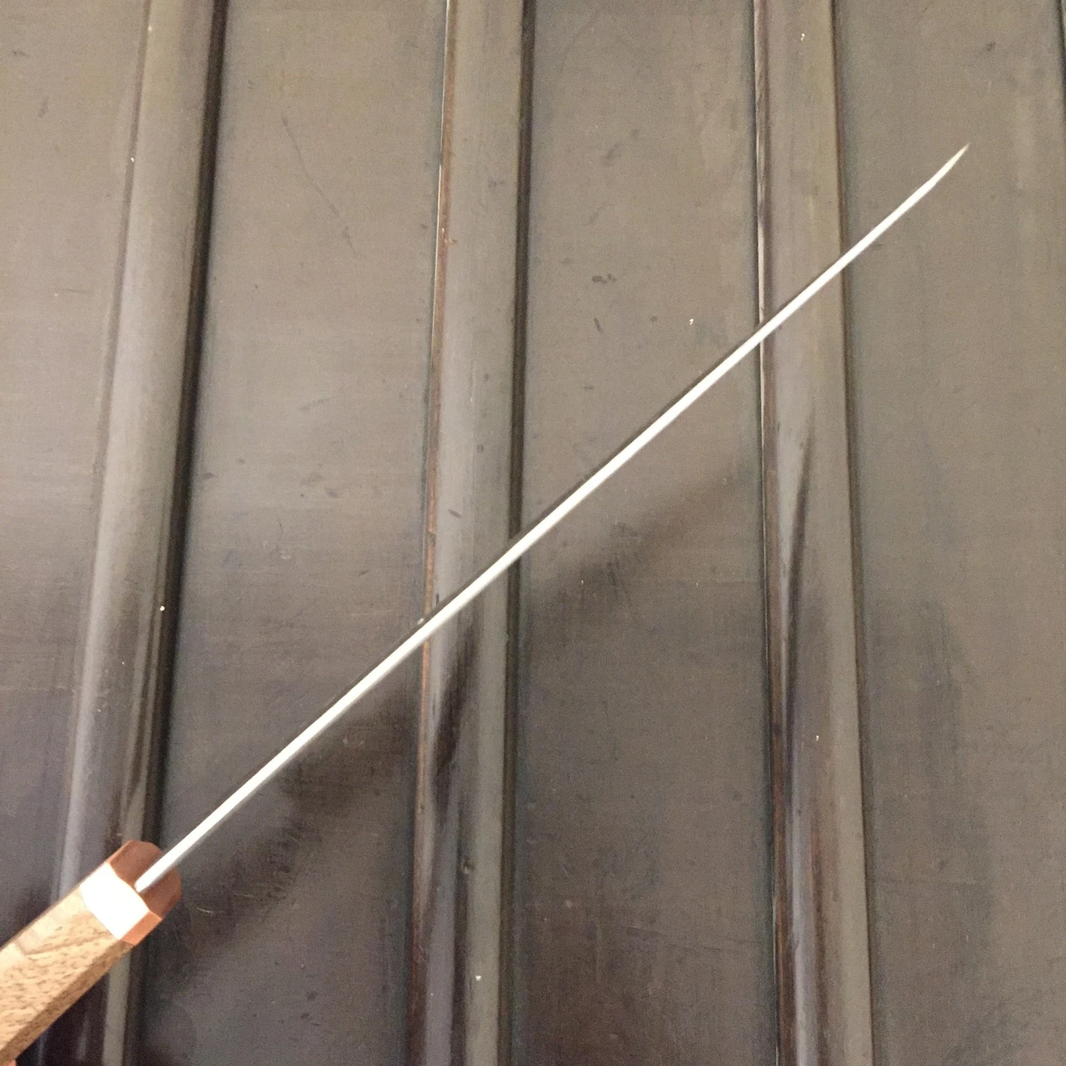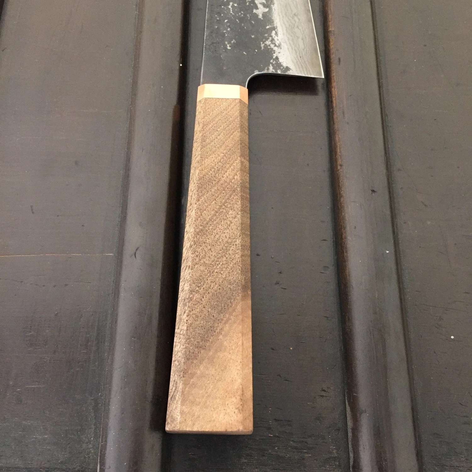 Forged, ground and handles made by hand at the Blenheim Forge works in Peckham South London. Blenheim Forge knives are made with Japanese aogami super tungsten carbon steel and English woods and handle materials.