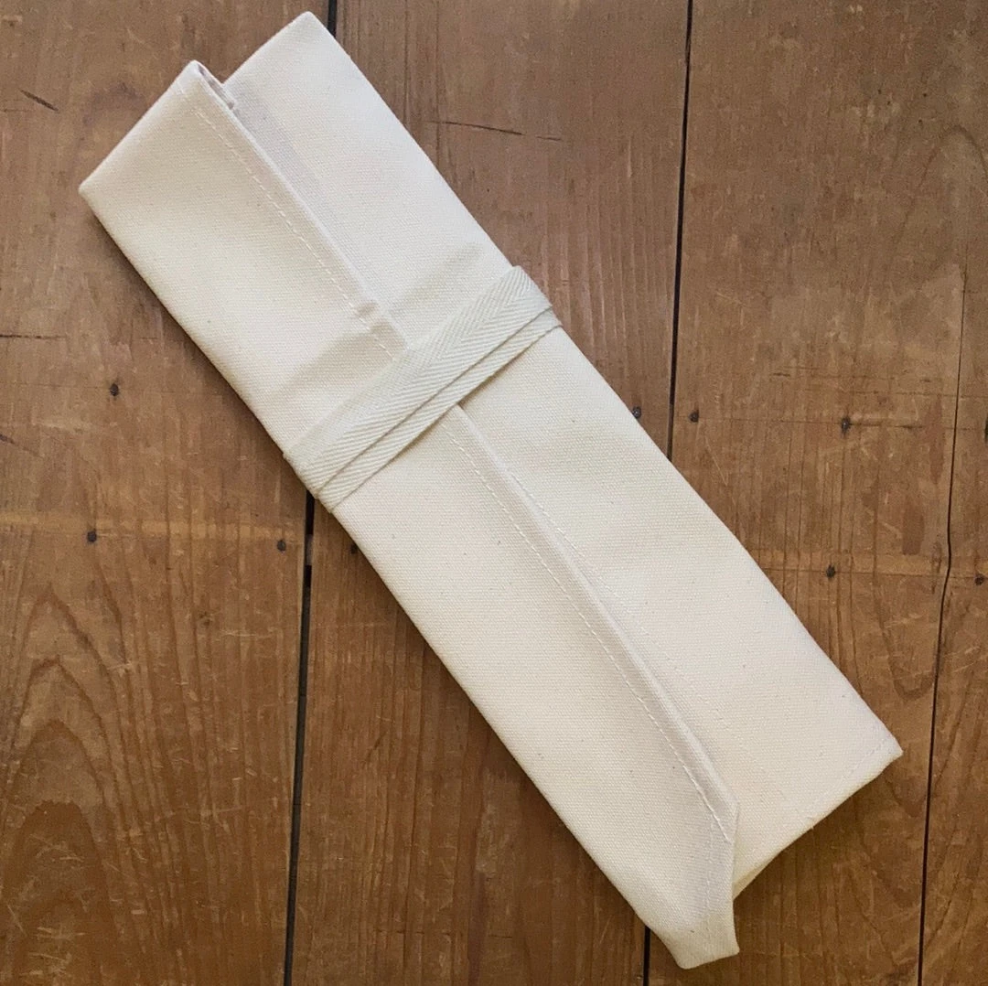 Lightweight compact canvas knife roll with hemmed edges. 5 slots with short cover flap and no tool pocket. Opens tall enough to fit up to 210mm knife with saya.