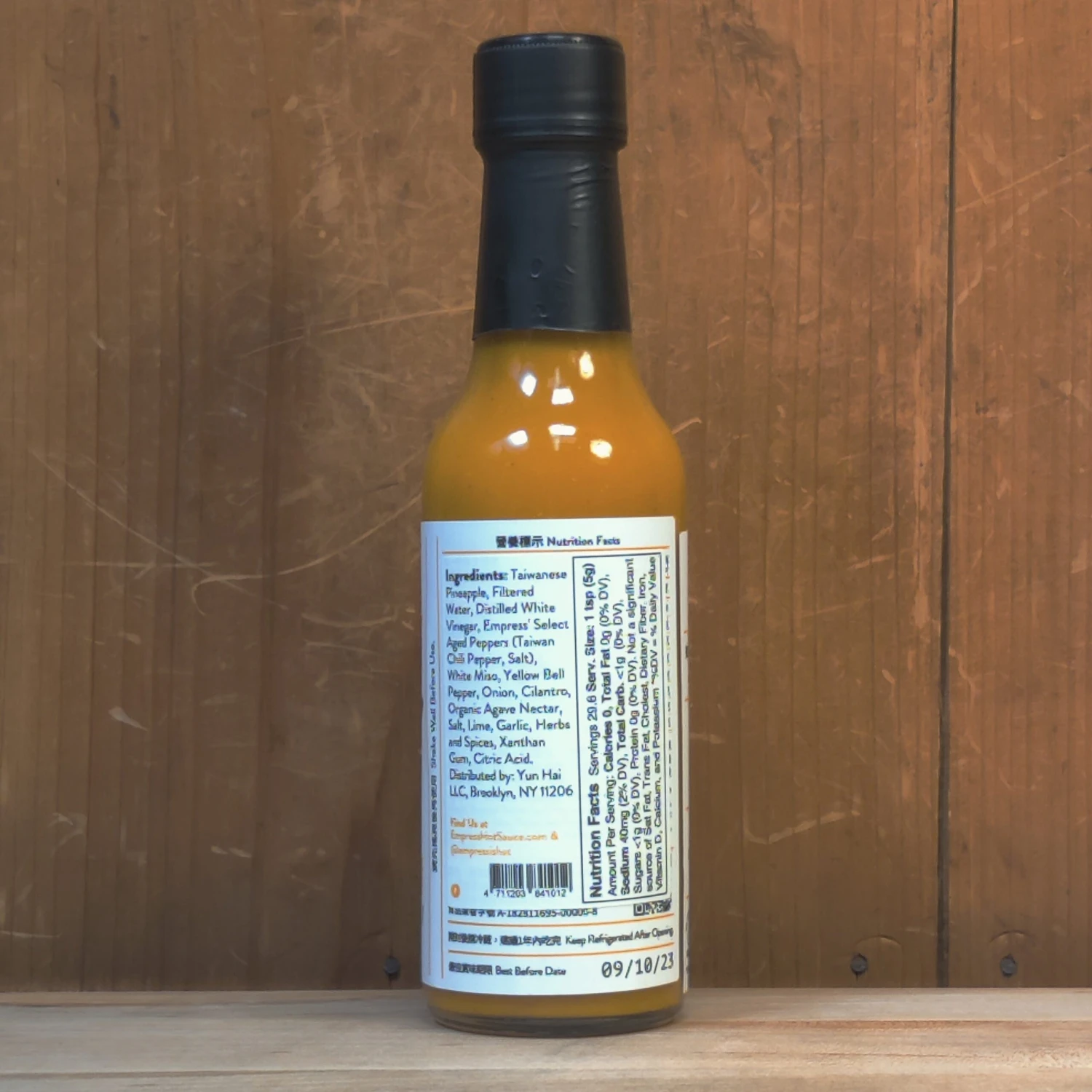 Ingredients: Taiwanese Pineapple, Filtered Water, Distilled White Vinegar, Empress’ Select Aged Peppers (Taiwan Chili Pepper, Salt), Organic White Miso, Yellow Bell Pepper, Onion, Cilantro, Organic Agave Nectar, Salt, Lime, Garlic, Herbs and Spices, Xanthan Gum, Citric Acid