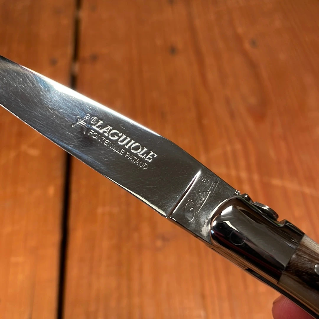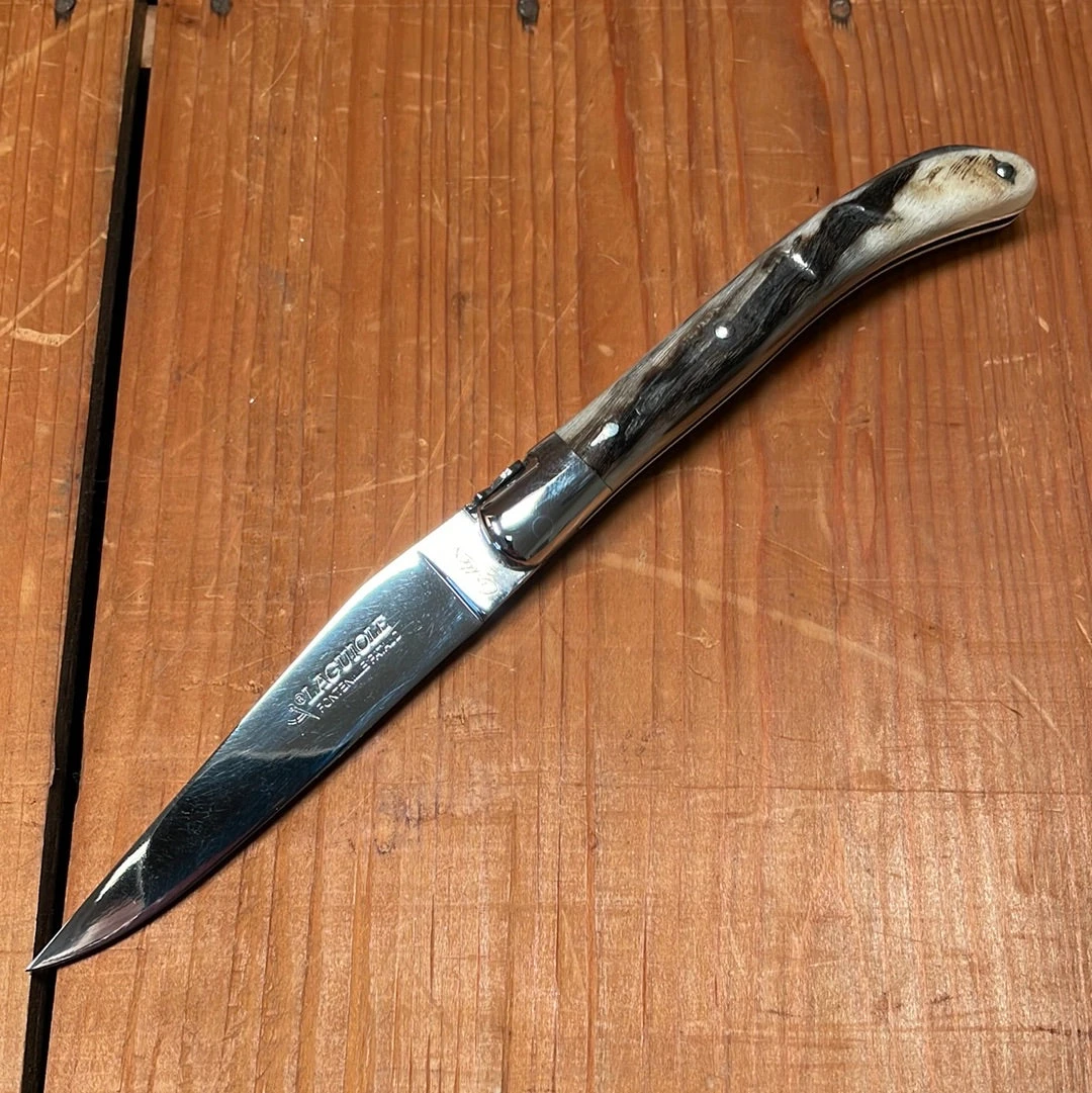 The Laguiole knife has a distinctive design influenced by the Spanish Navaja. A smaller, more tactile version was made for the sheep-herders on the Aubrac plateau in France, and was named after the town Laguiole. In addition to the iconic ‘bee’ or ‘fly’ on the spring, typically they feature a semi yataghan shaped blade, a slip joint mechanism with a slim tapered handle made from natural material, traditionally cow horn.