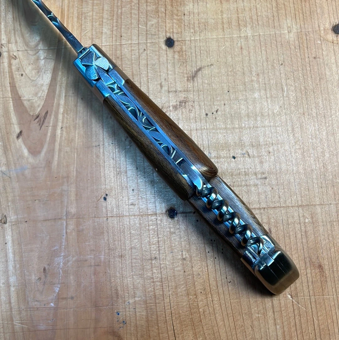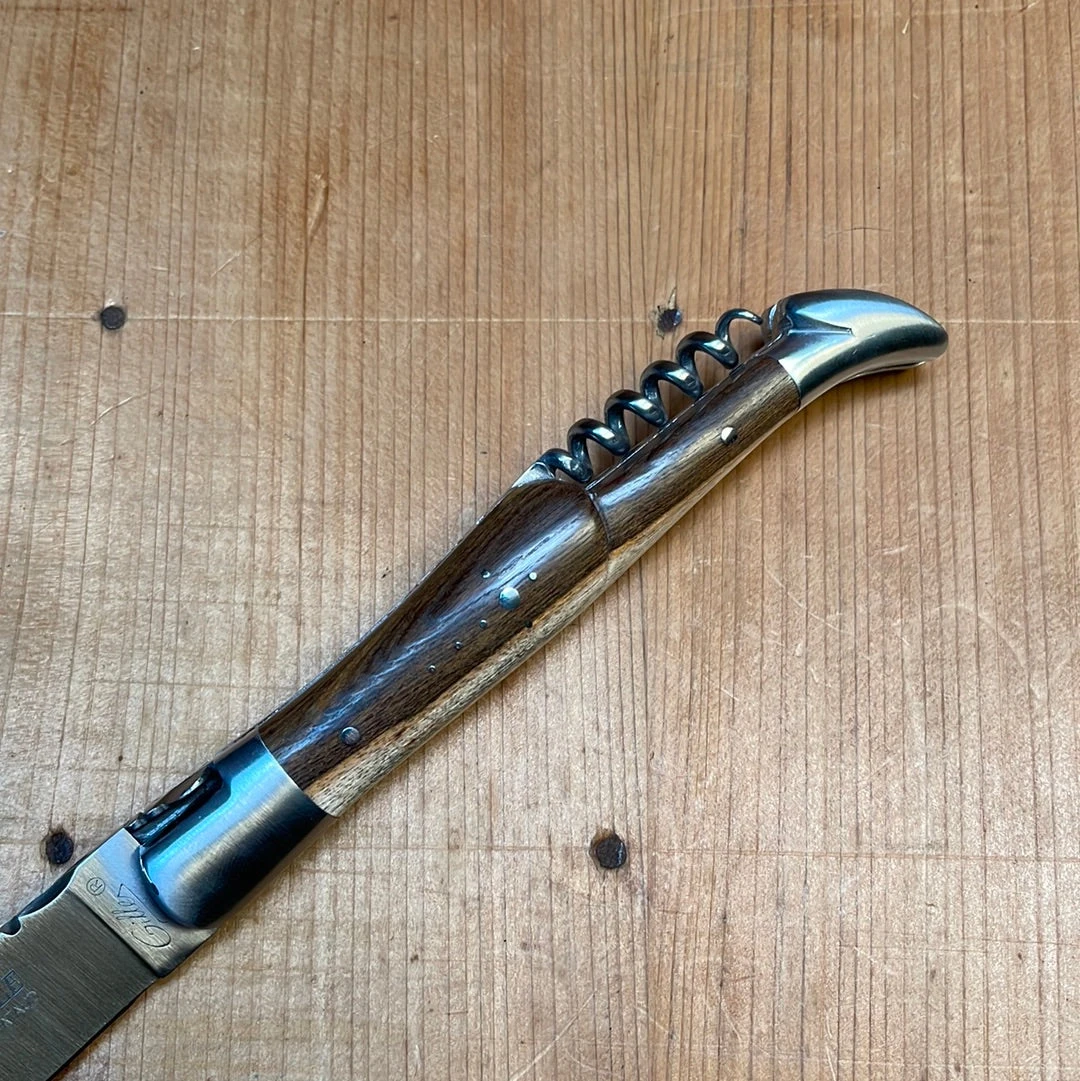 Hand made in France by Fontenille Pataud with a stainless blade, stainless bolsters and corkscrew, and hand filed spring (no lock on this one) at the butt of handle which is hafted in pistachio wood.