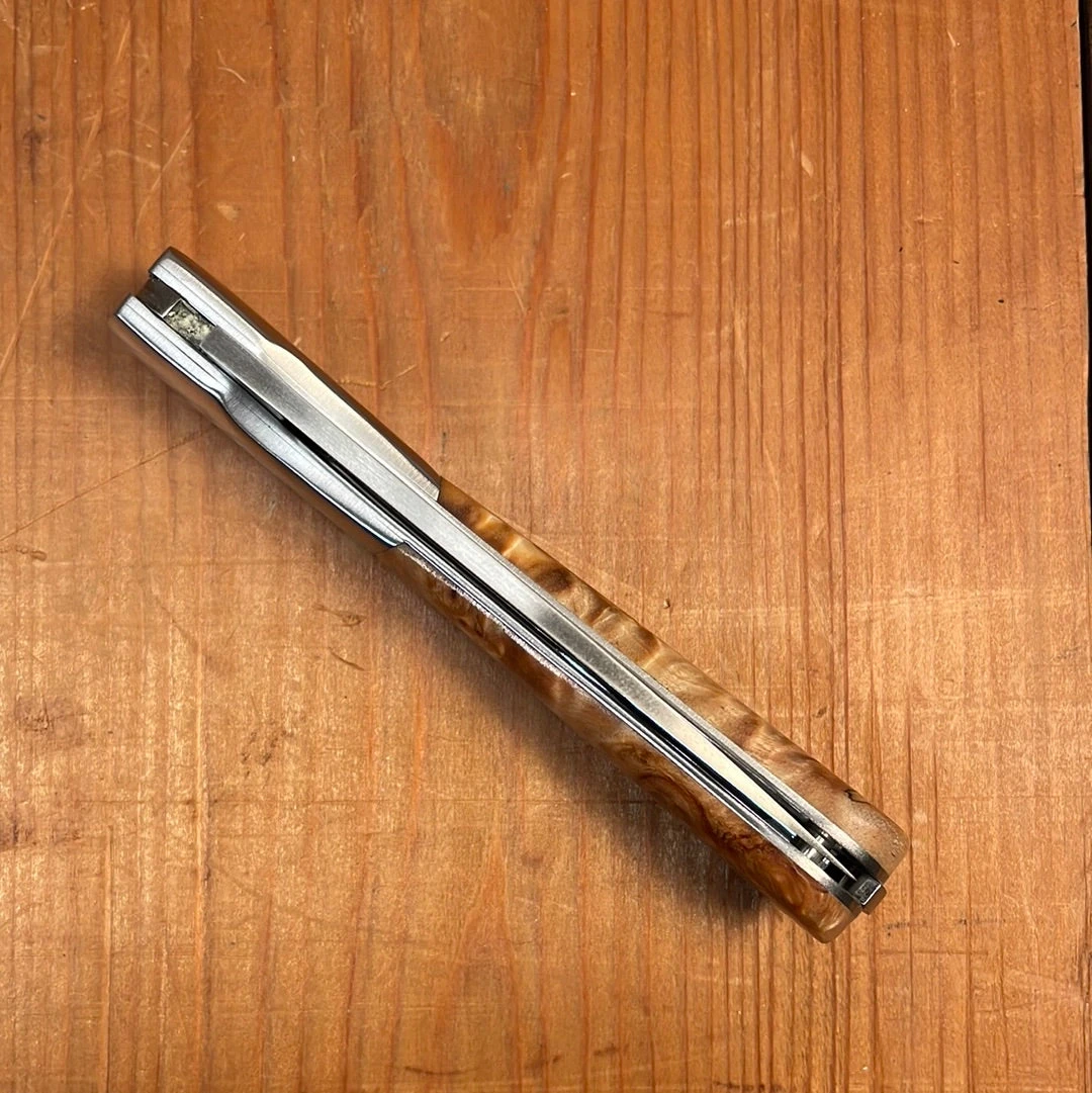 Hand made in France by Fontenille Pataud stainless blade, stainless bolsters and hand filed spring and locking release at the butt of handle which is hafted in stabalizd poplar burl.