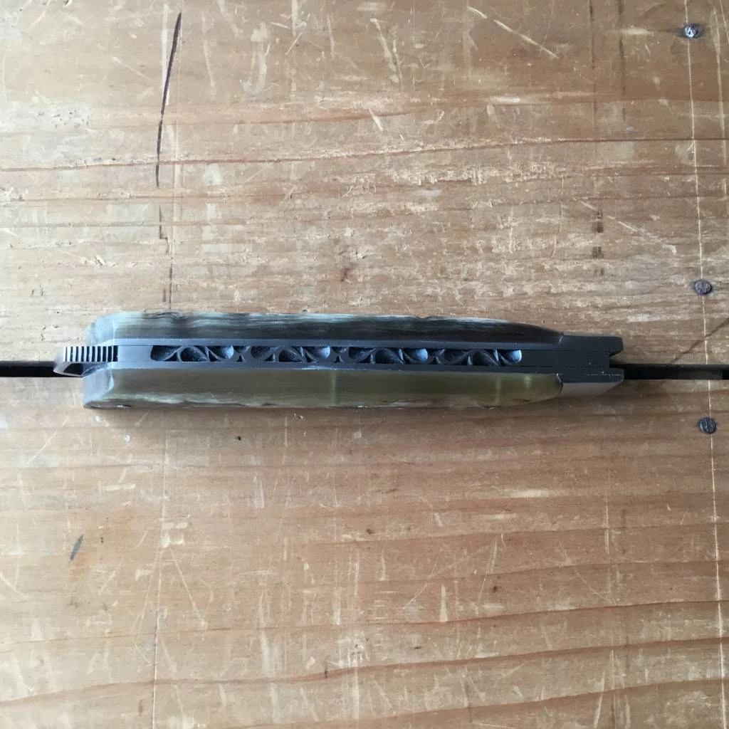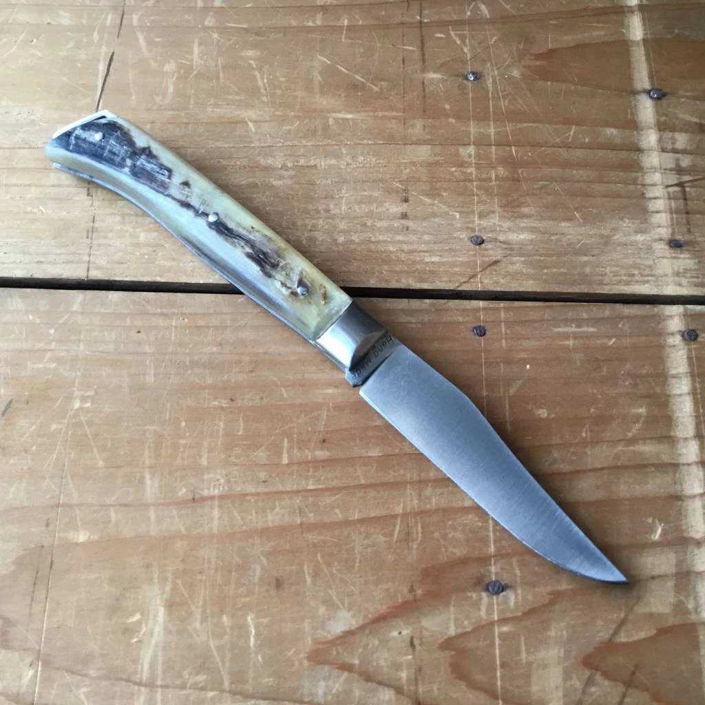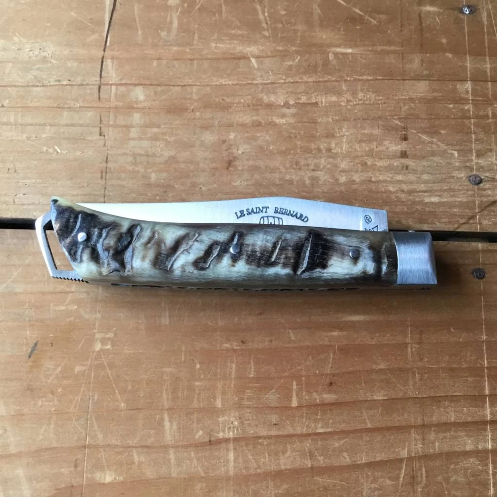 Fontenille Pataud ‘Saint Bernard’ 11cm folding knife with lock-back mechanism. 12c27 stainless steel blade and ram horn handle scales. 92 grams. 200mm overall length. 85mm cutting edge. 110mm closed length.