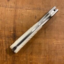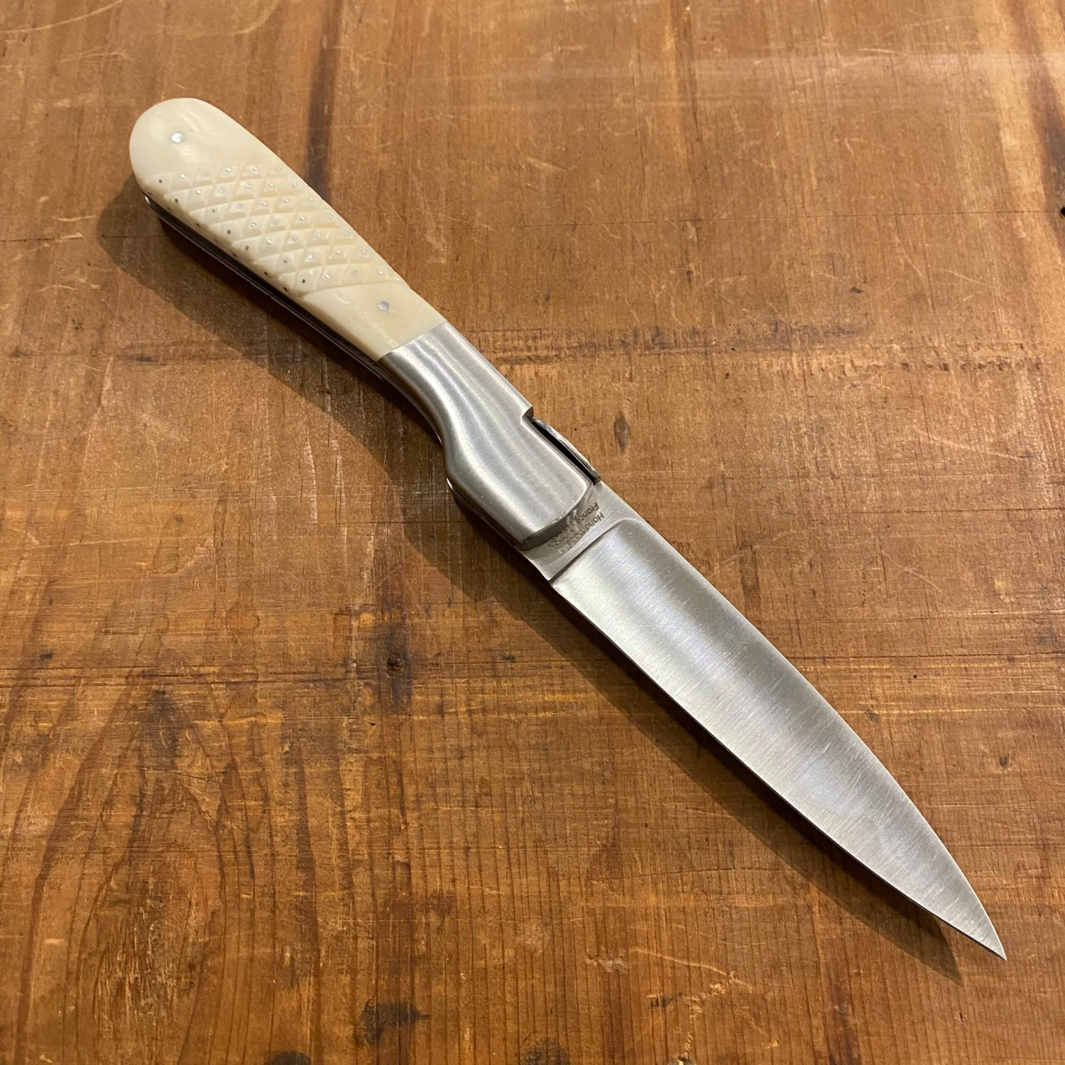 Hand made in France by Fontenille Pataud stainless blade, stainless bolsters and hand filed spring and locking release at the butt of handle which is hafted in hand carved cow bone with nickel pin inlays.