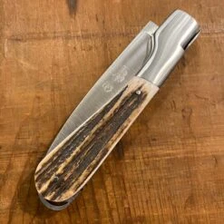 Hand made in France by Fontenille Pataud stainless blade, stainless bolsters and hand filed spring and locking release at the butt of handle which is hafted in stag.