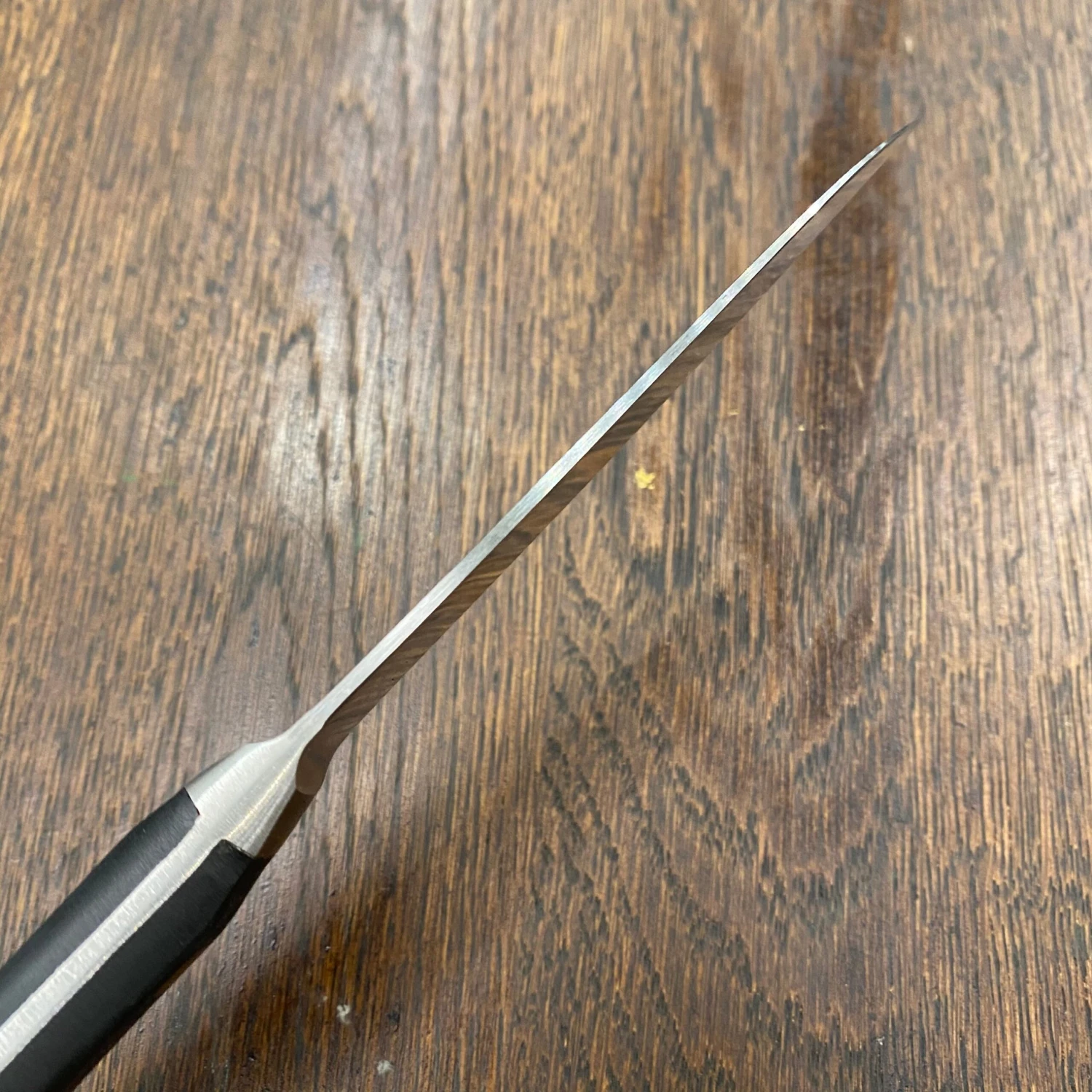 3.5″ drop forged stainless steel western chef’s knife with black POM riveted handle with Pikas Spade insignia.