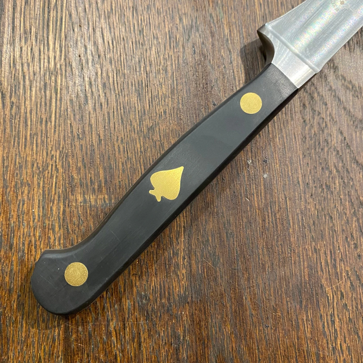 6.5″ drop forged stainless steel stiff boning knife with riveted black POM handle with Pikas Spade insignia.