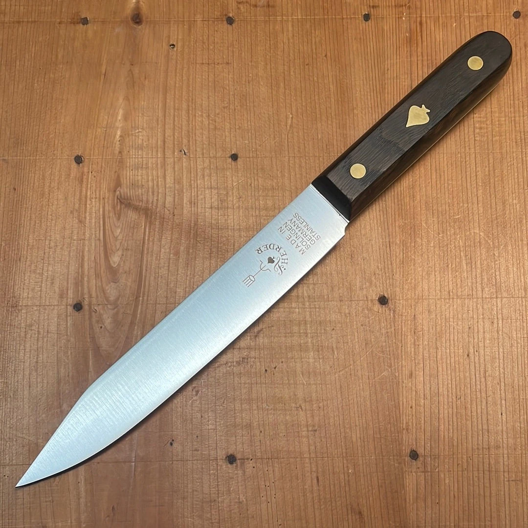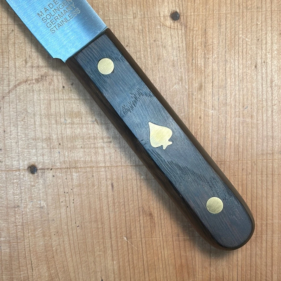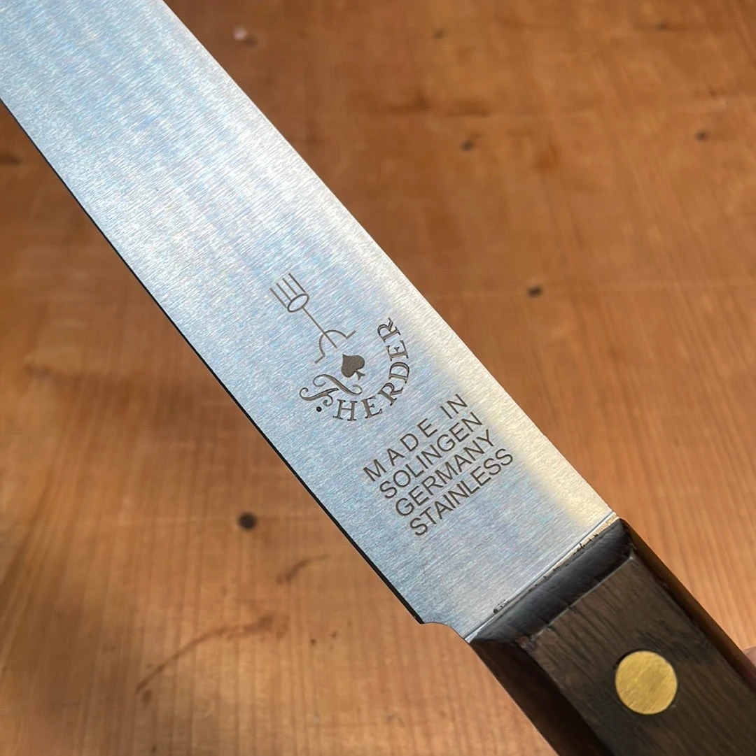 Friedr. Herder Abr Sohn company is the longest continually operating knife making operation in Solingen Germany. It’s famous Pikas spade logo was registered in 1727 although their place in Solingen’s blade making traces further back. Friedr Herder has kept many old patterns in carbon steel in production and offers a variety of new production knives for professionals and home cooks. We are happy to include these in our lineup. When looking for old knives seeing that Herder handle with the spade rivet peeking out is always exciting, we think it’s still true of the new production knives as well.