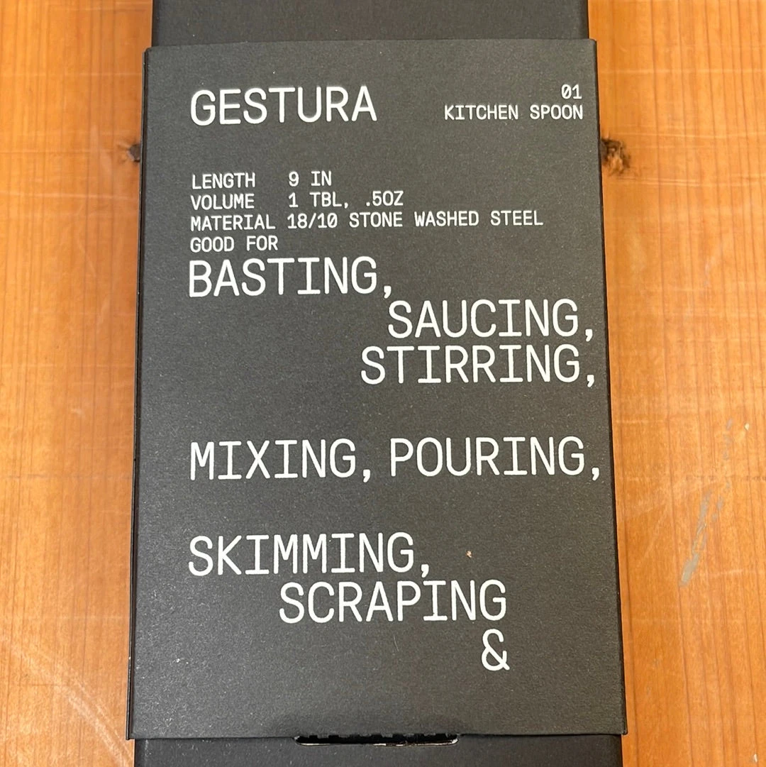 Many cooks have a spoon for basting, one for scraping, one for saucing, another for flipping fish, and the list goes on. The Gestura was designed by professional cook Gabriel Rudolph to do the variety of jobs that would normally take an array of various vintage spoons. The Gestura 01 was designed with a tablespoon measuring capacity to help with recipe continuity and to reduce the number of tools a professional would need on hand.