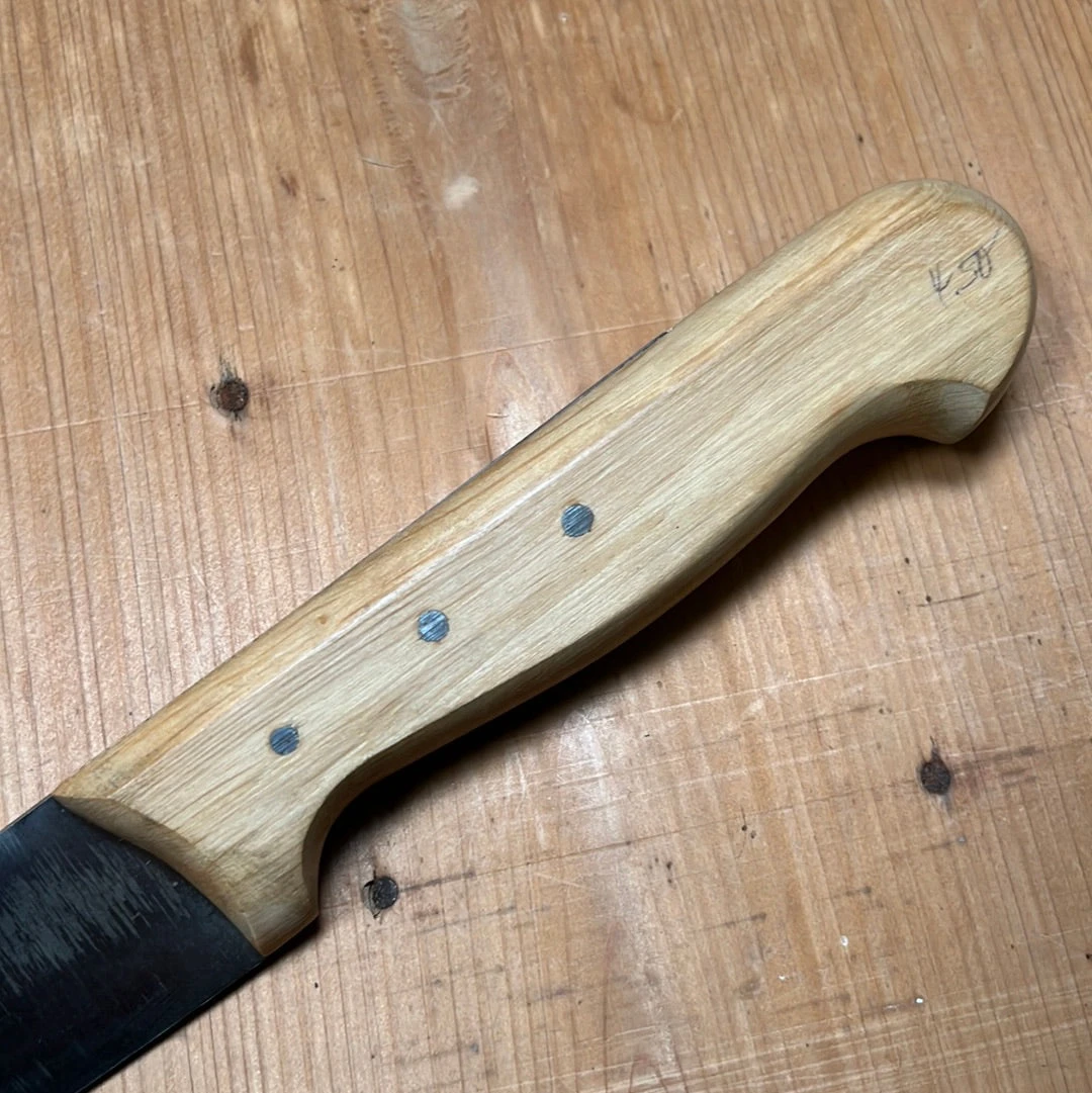 Hand ground stainless blade and light hardwood handle (with original $4.50 price penciled in). No shrinkage or issues on handle. Some light water marks and few bits of light rust on blade, see photos.