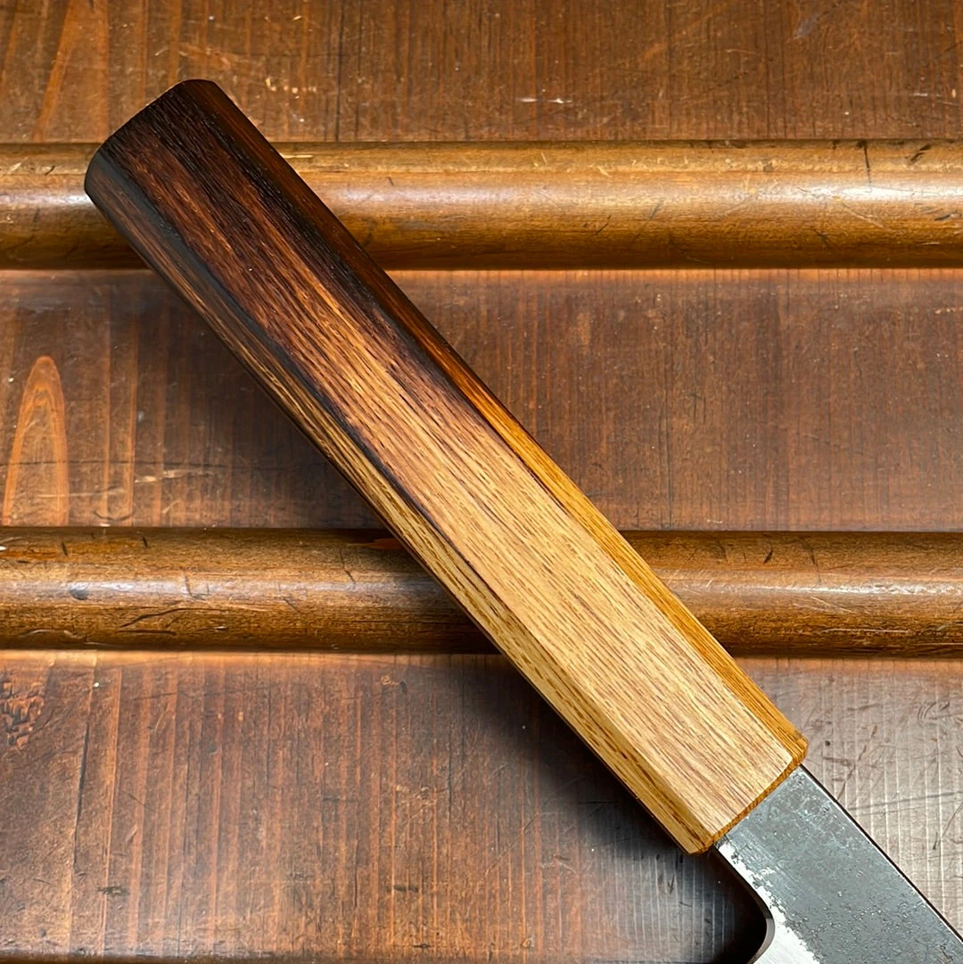Blade is hand forged shirogami #2 with a rustic style kurouchi finished soft iron cladding. Handle is octagonal burnt oak sealed with a thin clear urushi lacquer coating.