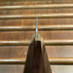 The finish grinding is excellent with a mirror finish over the face of the blade with finished spine and choil. The hand-finished flat wide bevel (kireba) will make for easy maintenance thinning.
