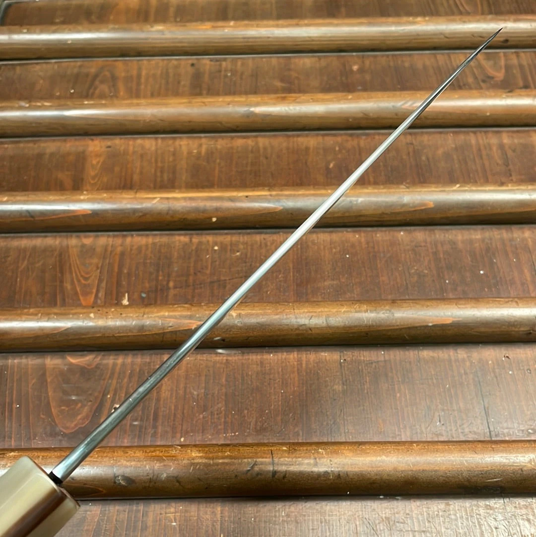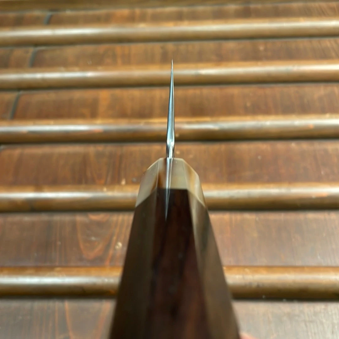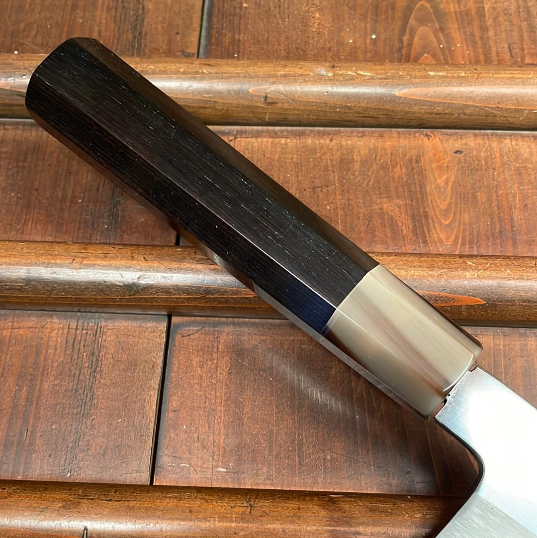 Hand forged iron clad aogami 2 gyuto with blonde horn ferruled ebony handle. These have a tall heel and a robust feel with a thicker spine over the heel and belly. A strong distal taper makes for a nimble fine tip.