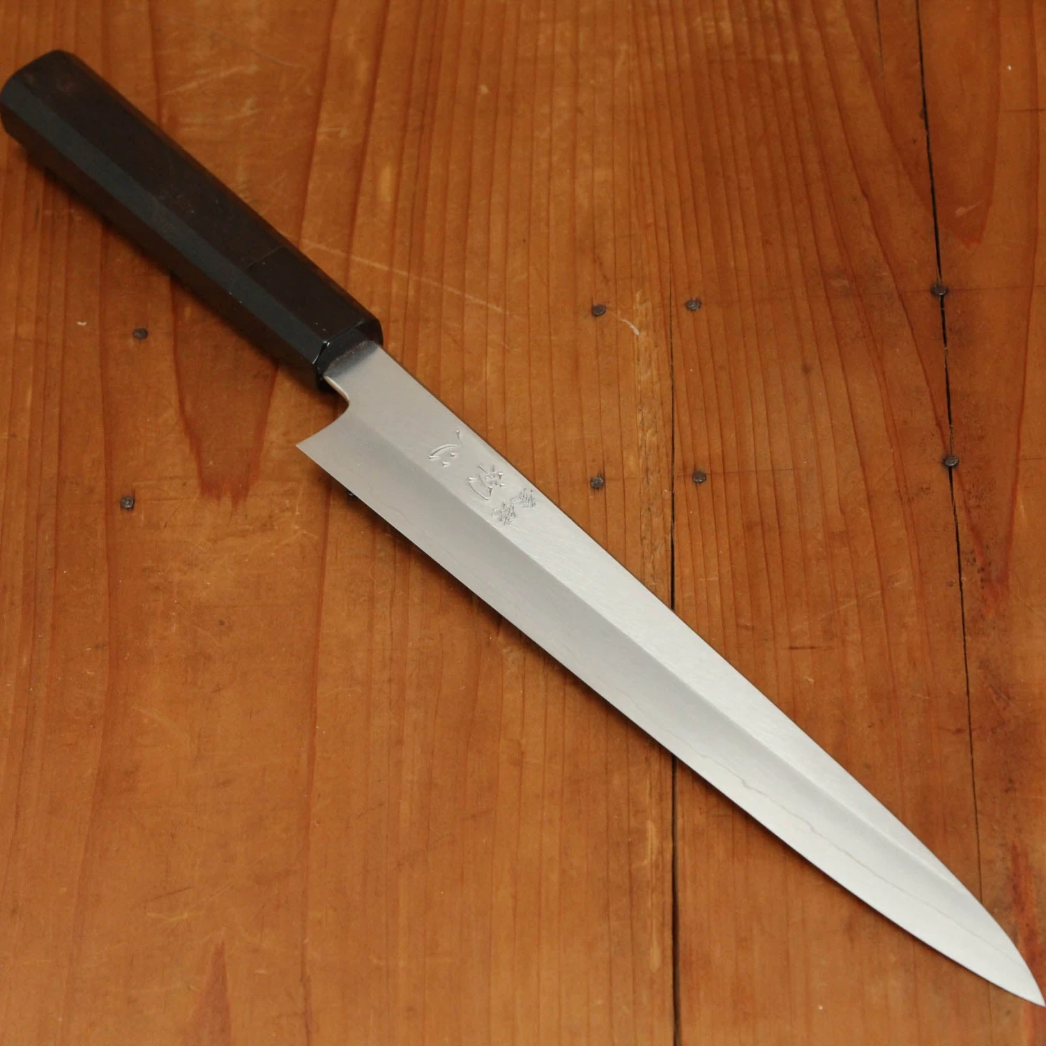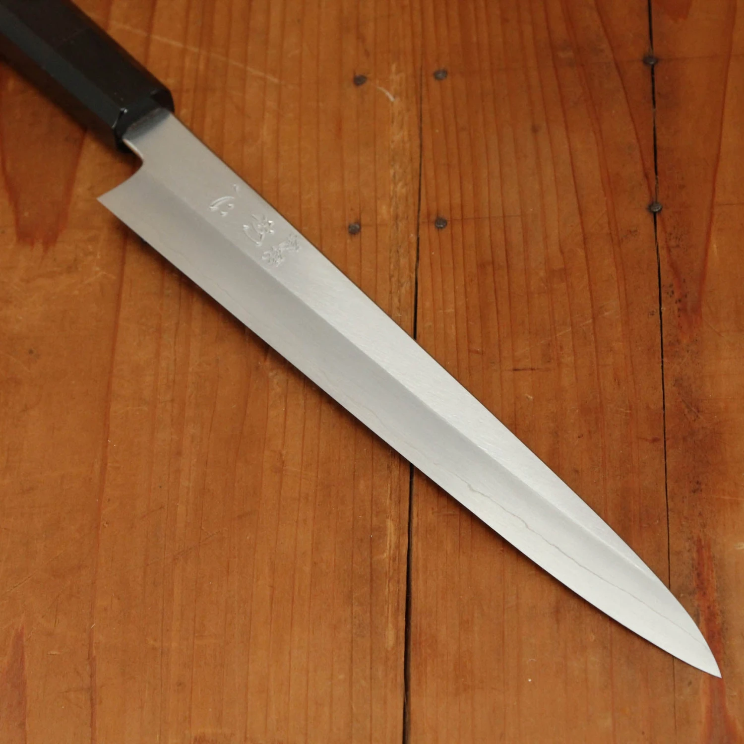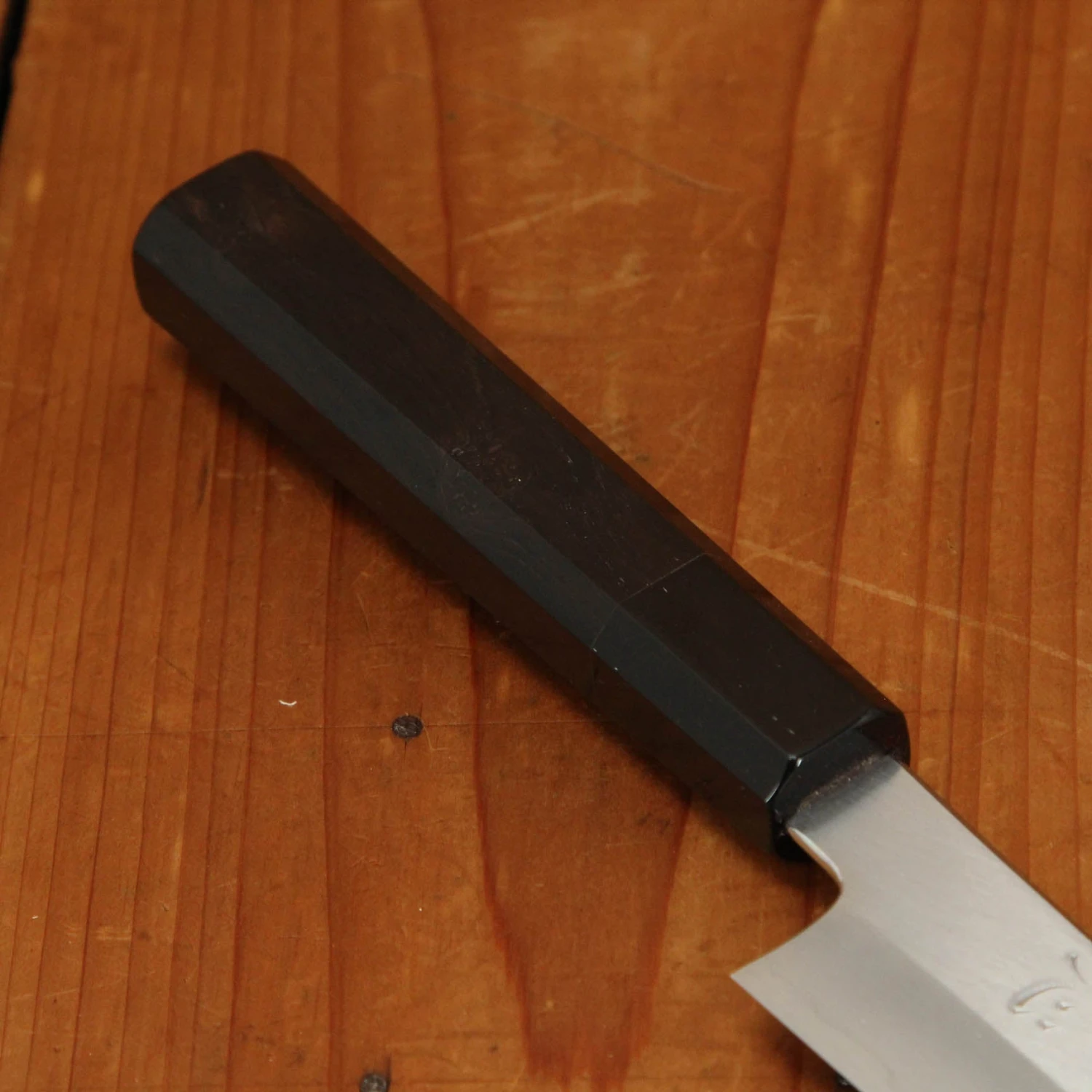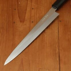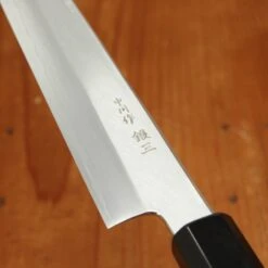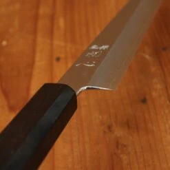Nakagawa-san’s knives are characterized by superb edge formation and edge life with good toughness. This is due to excellent heat control during forging and a very thorough heat treatment. His carbon steels are easy to sharpen across most steel types. Nakagawa-san is one of only a few blacksmiths in Sakai to forge Ginsanko and VG10 stainless steels. His ginsanko is one of the best we have used and sharpened, with superb edge life, toughness and edge formation.