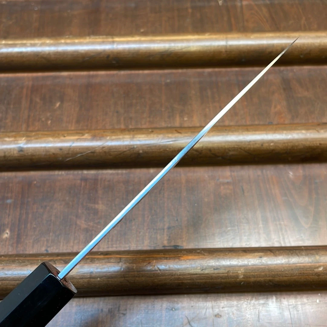 Forged iron clad shirogami 2 carbon steel with horn ferruled wenge handle.