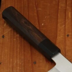 Nakagawa-san’s knives are characterized by superb edge formation and edge life with good toughness. This is due to excellent heat control during forging and a very thorough heat treatment. His carbon steels are easy to sharpen across most steel types. Nakagawa-san is one of only a few blacksmiths in Sakai to forge Ginsanko and VG10 stainless steels. His ginsanko is one of the best we have used and sharpened, with superb edge life, toughness and edge formation.