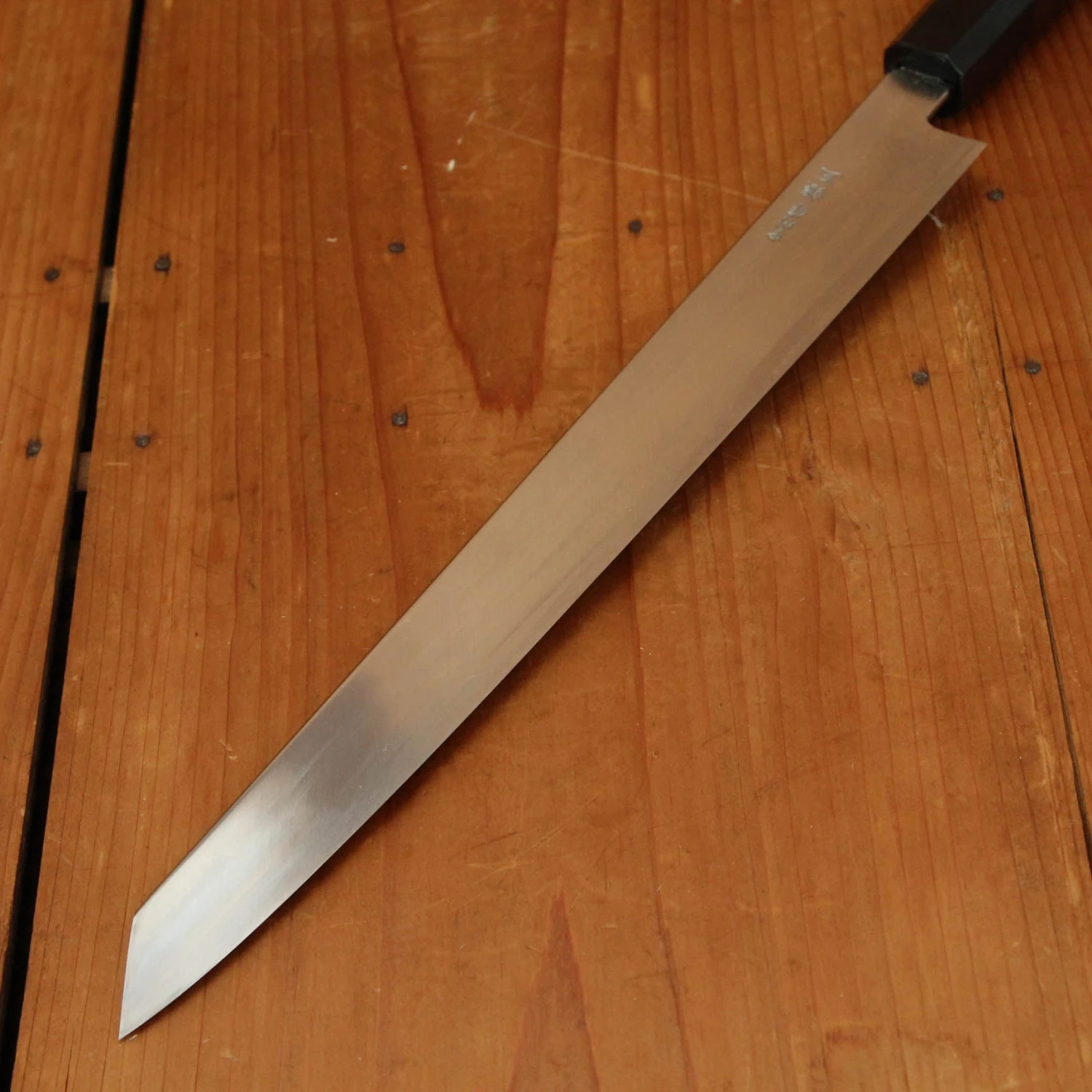These have a solid feel with little overall flex but the edge is super thin and ‘nail-going’; it can be temporarily bent with pressure against a fingernail, an old style test for proper thinness on a fine ground blade. While not the thinnest in our stock at the spine behind the edge they are quite possibly the thinnest. They will cut very very smoothly but can be easy to damage if any twisting, lateral pressure or scraping is applied. These are best suited for those already using thin edged Japanese knives and maybe not the best first Japanese knife for someone used to forgiving tougher knives.
