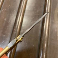 Brass handled higonokami folding knife with hand forged mild steel and blue steel aogami core. Blade is approx 65mm and overall length open is approx 159mm. 105mm closed length (92mm handle). 39.7 grams.
