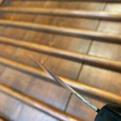 Hand ground VG10 mono steel with a nice taper and convex hamaguri grind. This fine grind makes for smooth cutting and excellent food release with a long edge life and excellent stainless property. VG10 can be more work to sharpen as they get sharpened down but that will take quite some time as the thin convex grind keeps the blade thin as it gets sharpened in.