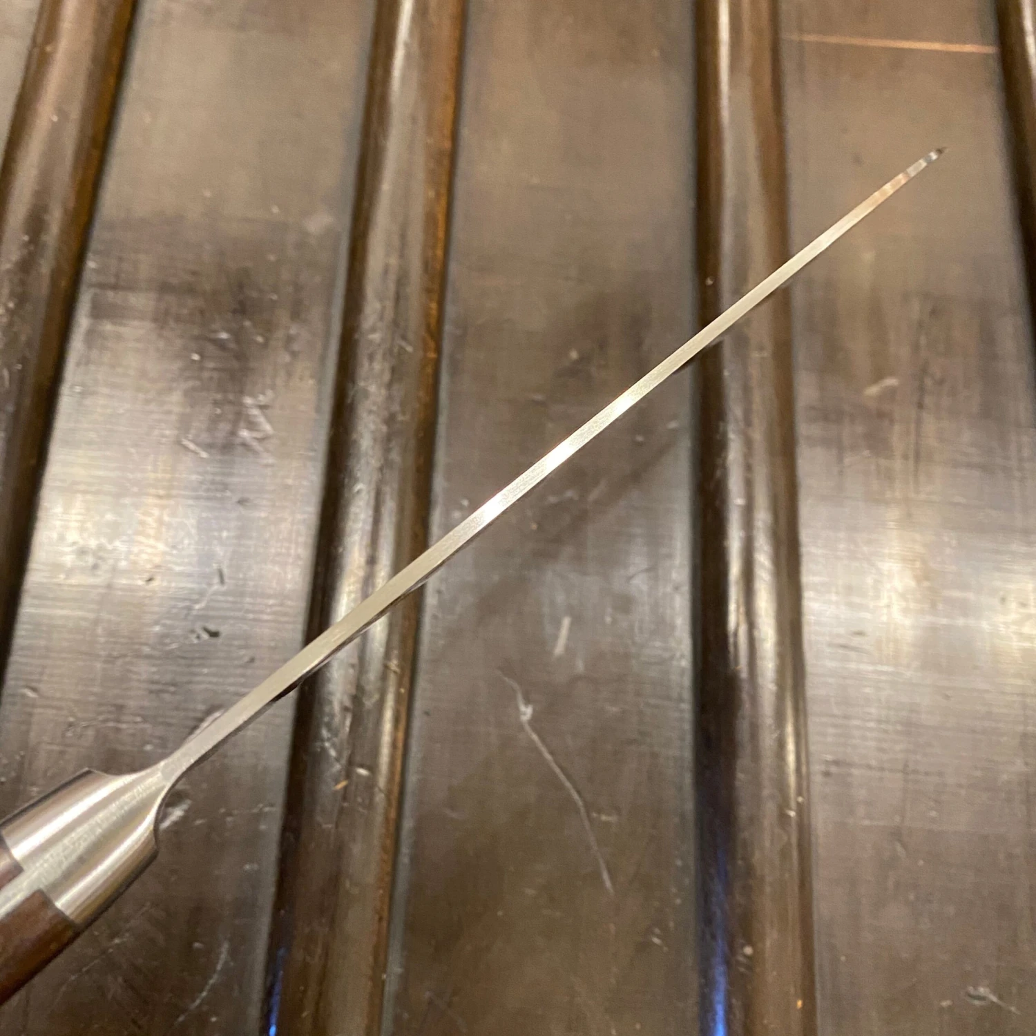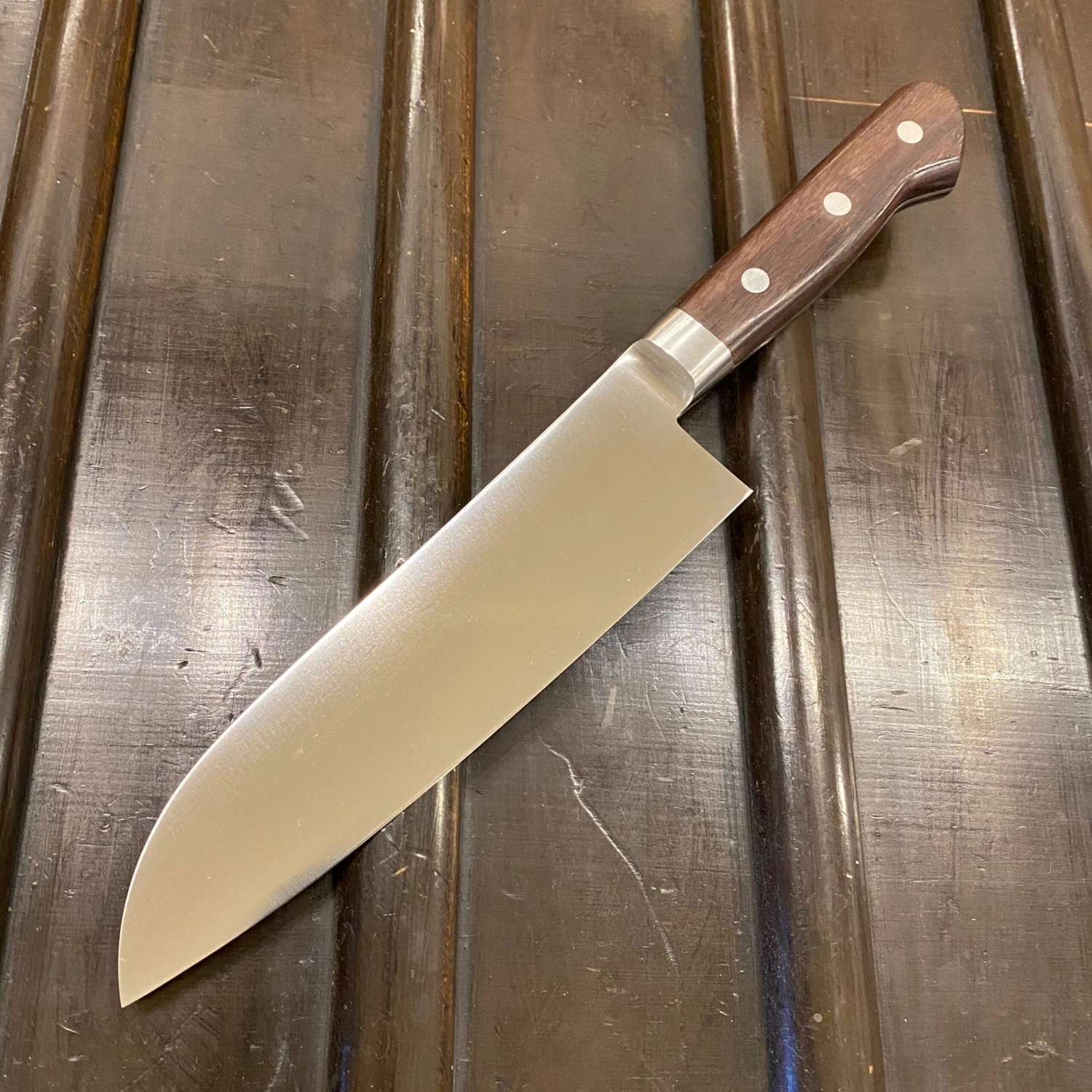 Made from mono steel VG1 stainless with rosewood handle. These knives have all the merits of a classic stainless mono steel but with better edge formation and easier sharpening. An excellent cutting feel thanks to the fine, convex hamaguri grinds.