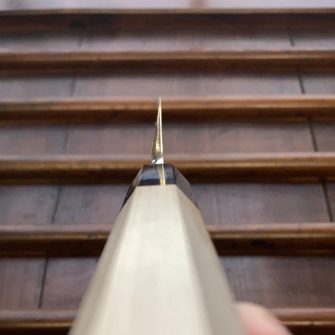 Deep ground ura hollow grind on the inside makes for excellent food release and helps to keep a narrow urasaki throughout the life of the blade and a polished spine and heel are a nice touch.