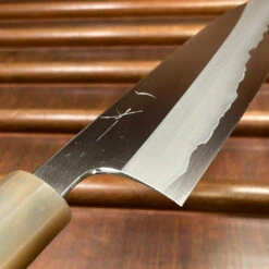 Hand made in Sakai, kasumi finish stainless clad aogami 1 forged by dentoukougeishi master smith Kenji Togashi and expertly ground by his son. Stainless clad aogami 1 is a less common combination as it is more challenging to work but it offers a great combination of the aogami 1 carbon steel’s fine edge formation and long edge life with the stainless steel’s ease of use.