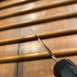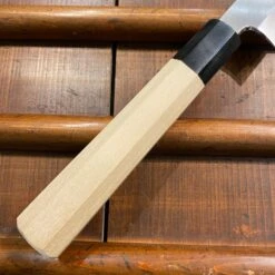 Hand made in Sakai, stainless clad shirogami 1 forged by dentoukougeishi master smith Kenji Togashi and expertly ground by his son. Stainless clad shirogami 1 is a less common combination as it is more challenging to work but it offers a great combination of the shirogami 1 carbon steel’s fine edge formation and long edge life with the stainless steel’s ease of use.