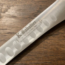 K Sabatier ‘Authentique’ series 12″ salmon slicer knife with grantons. Stainless steel blade with riveted olive wood handle.