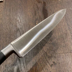 K Sabatier 6″ Utility knife is great for small work or for those prefer smaller blades, with enough clearance to chop it can be a better choice than a narrow utility for work where getting the whole blade onto the cutting board is needed.