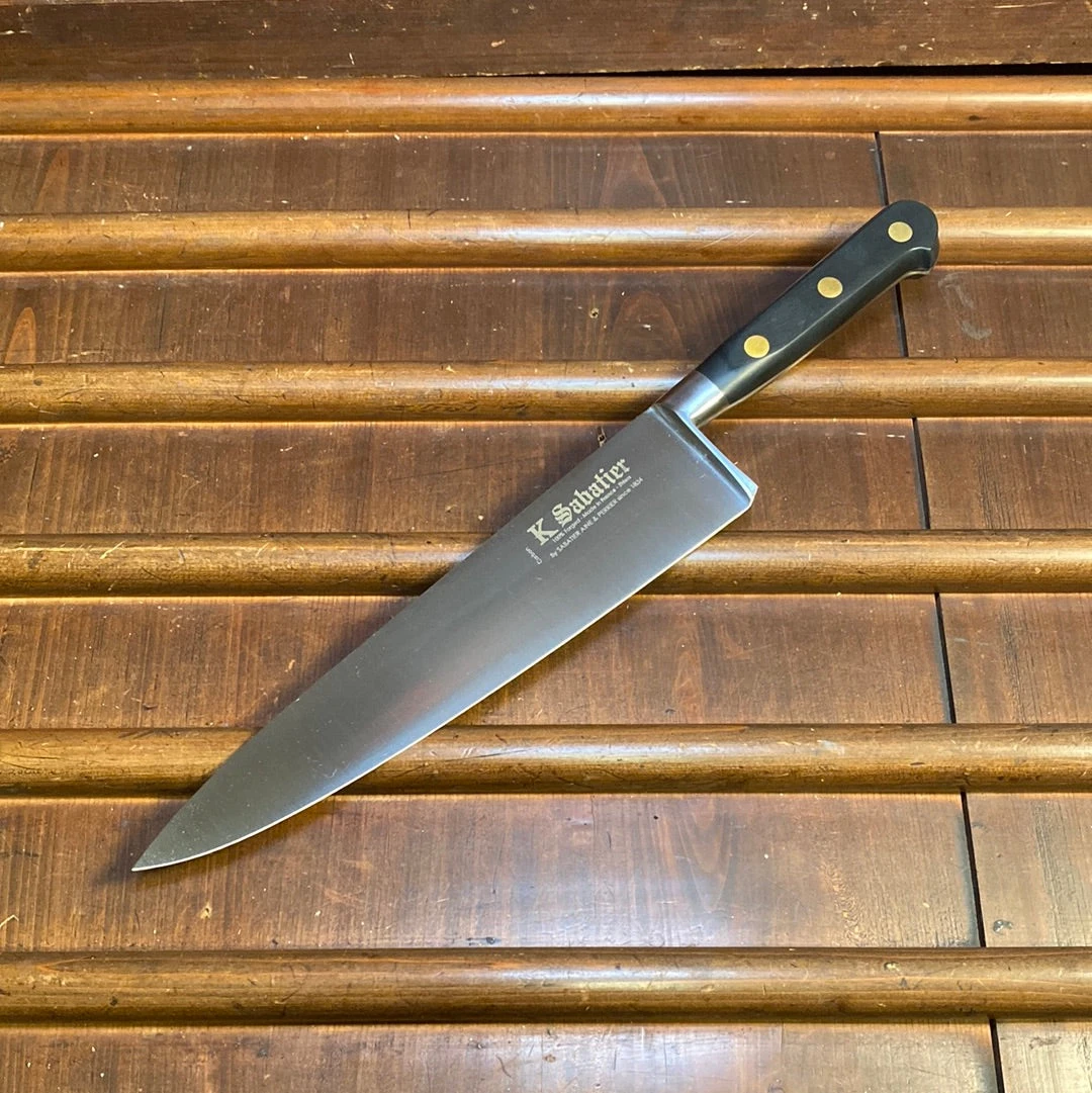 K Sabatier ‘Authentique’ series 9″ chef knife. XC75 carbon steel blade with brass riveted POM handle.