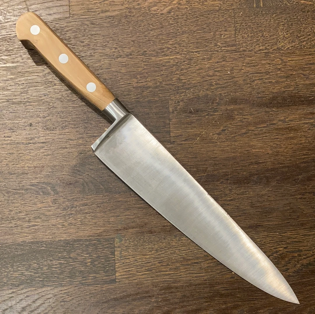 K Sabatier ‘Authentique’ series 9″ chef knife. XC75 carbon steel blade with riveted olive wood handle.