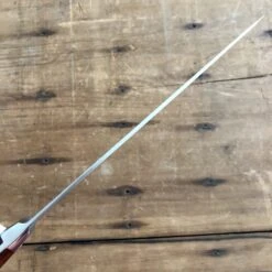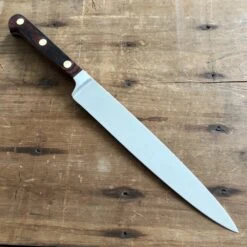 K Sabatier ‘Auvergne’ series 8″ Slicer knife. Forged stainless steel with red pakka wood handle and brass rivets.
