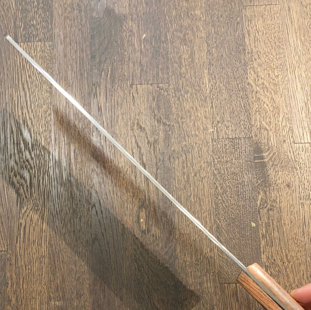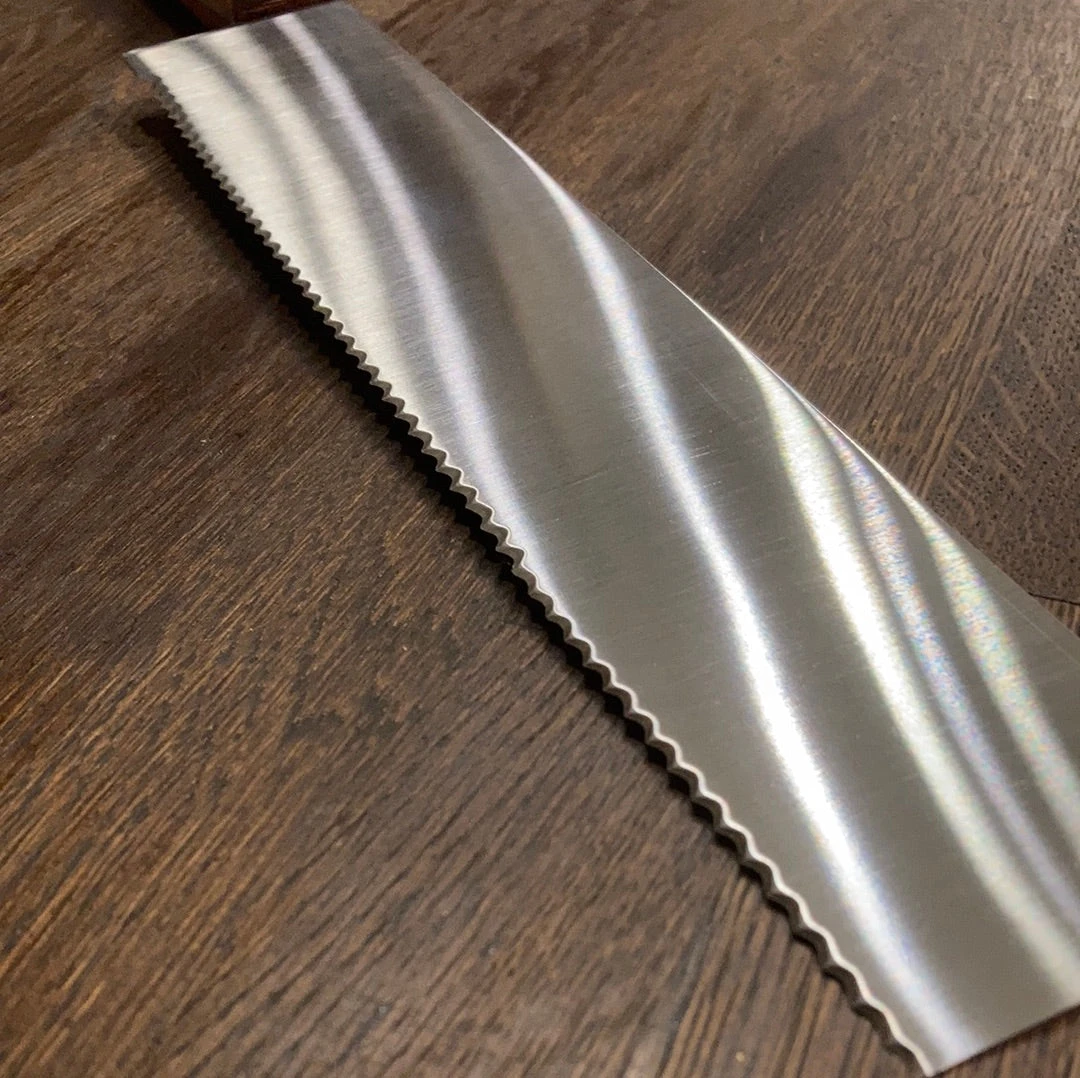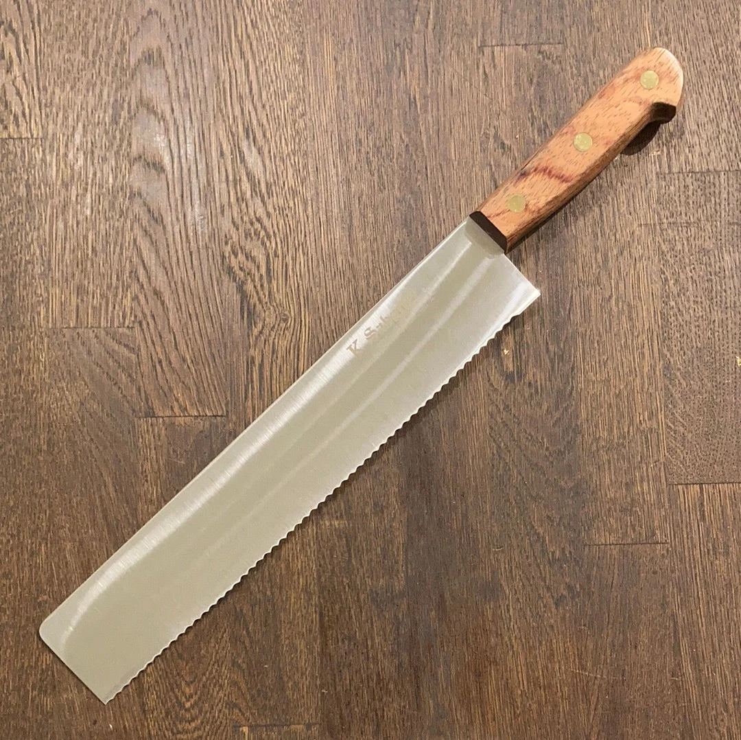 K Sabatier 11″ serrated bread knife. Stainless steel blade with brass riveted rosewood.