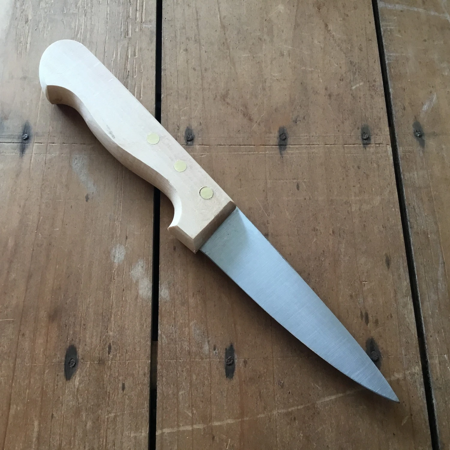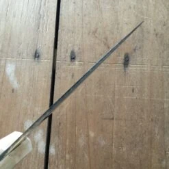 K Sabatier 4.25″ Saigner’ butcher knife with stiff triangular carbon steel blade and beech wood handle. Keep dry when not in use to avoid rust. No Dishwasher.
