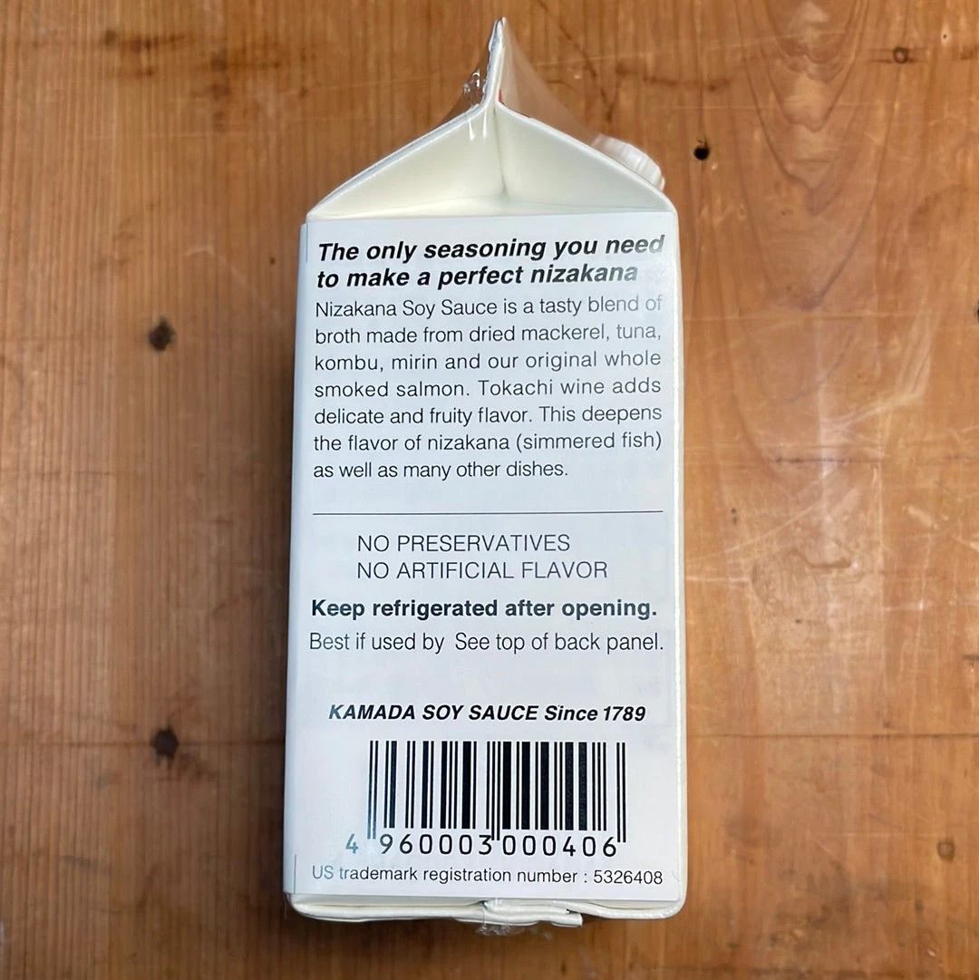To make the Nizakana Soy, Kamada added broth made from dried mackerel and tuna, seaweed, and their original smoked salmon to their home-brewed soy sauce. Mirin and wine add a hint of sweetness. This soy sauce gives a rich flavor to poached fish (nizakana) as well as many other dishes.