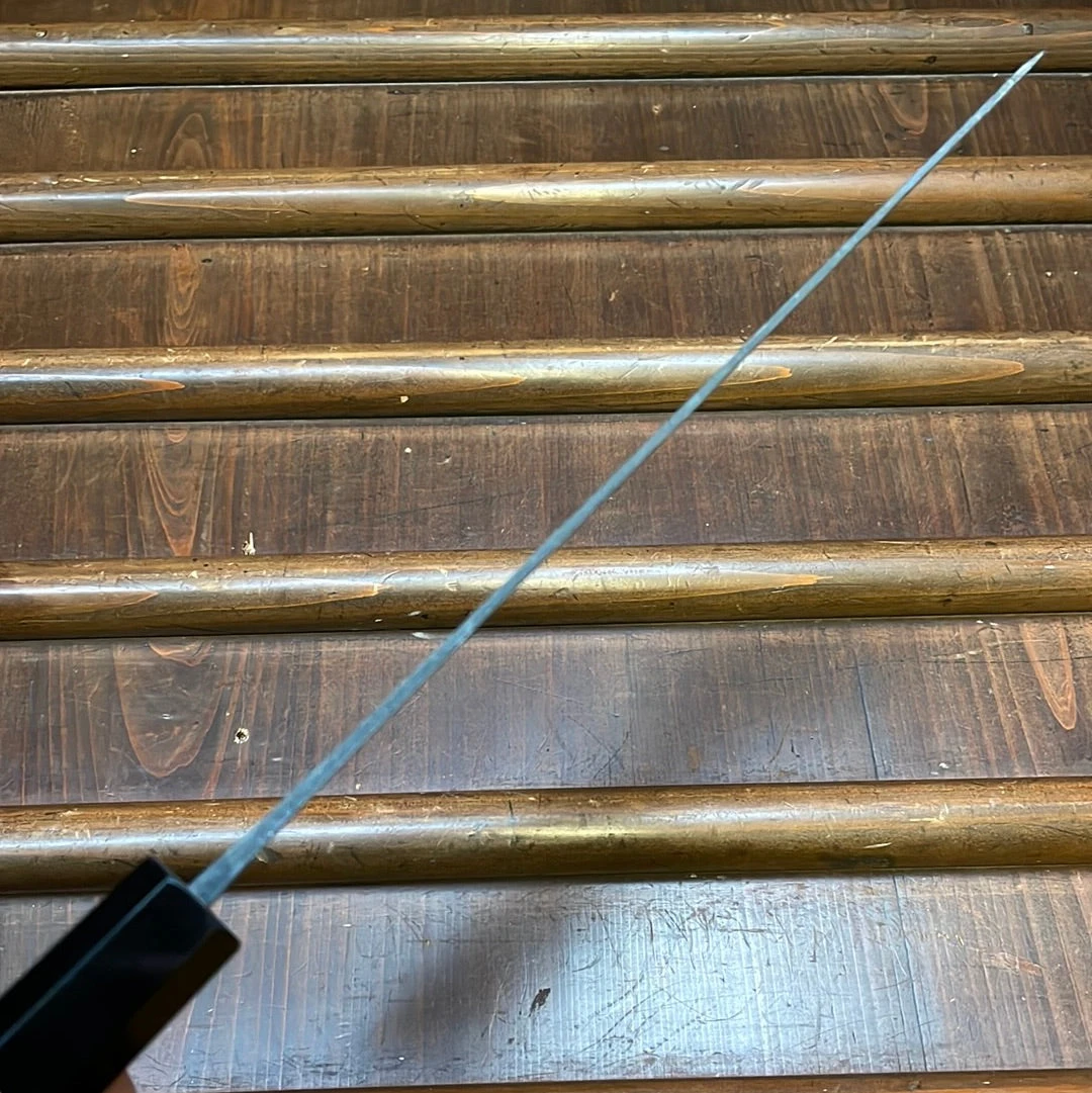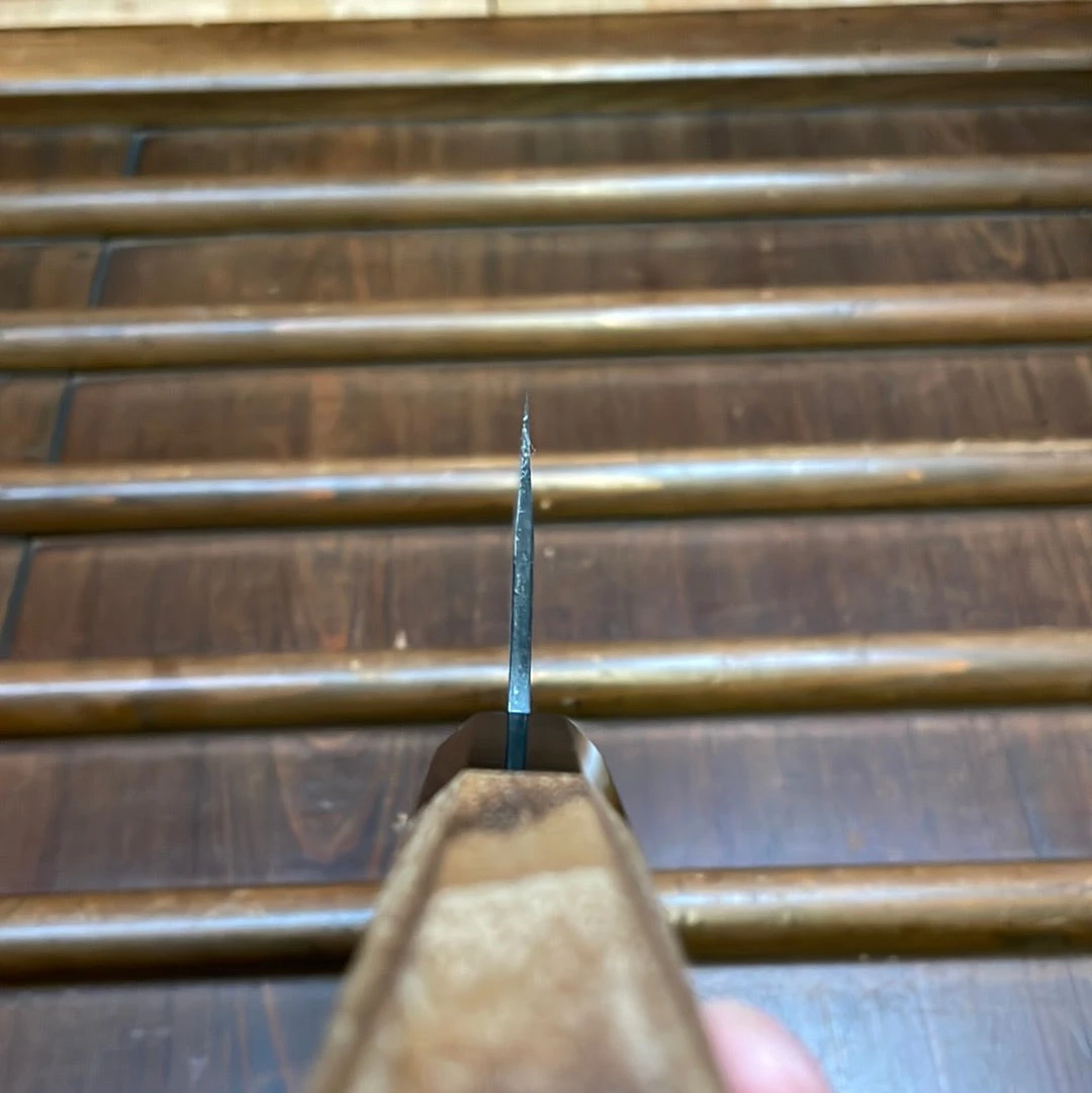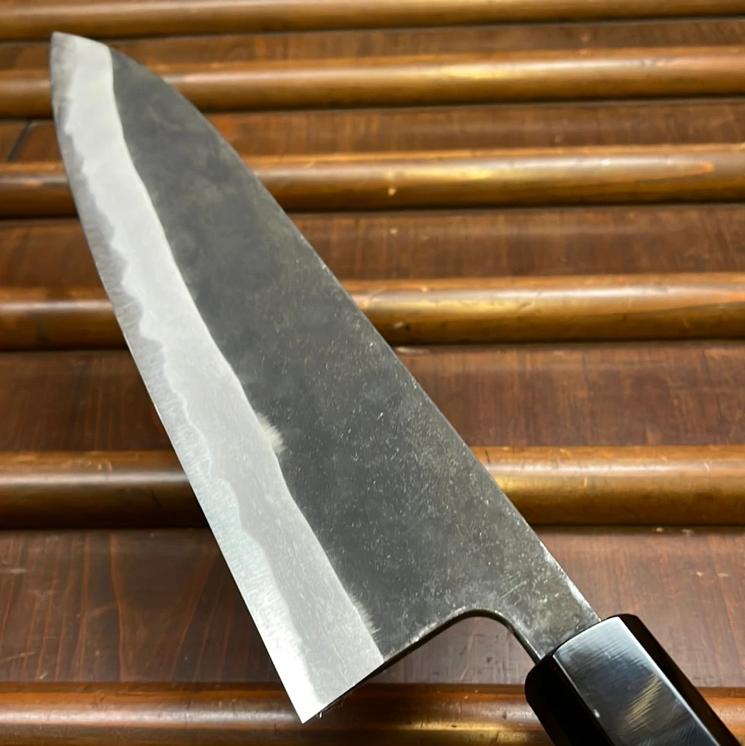 Hand forged in Takefu Japan by blacksmith Shiro Kamo with an iron clad aogami super core and horn ferruled teak handle.